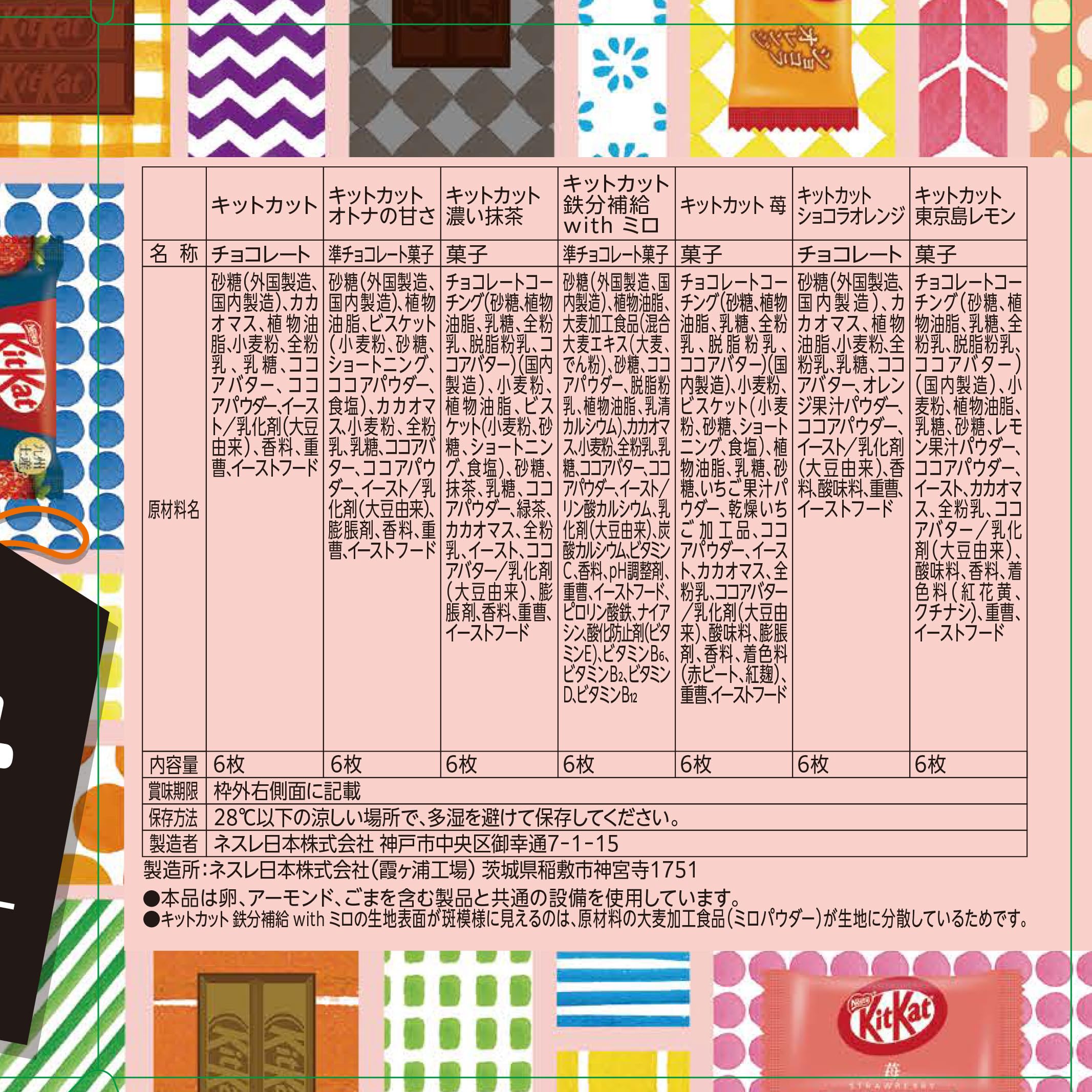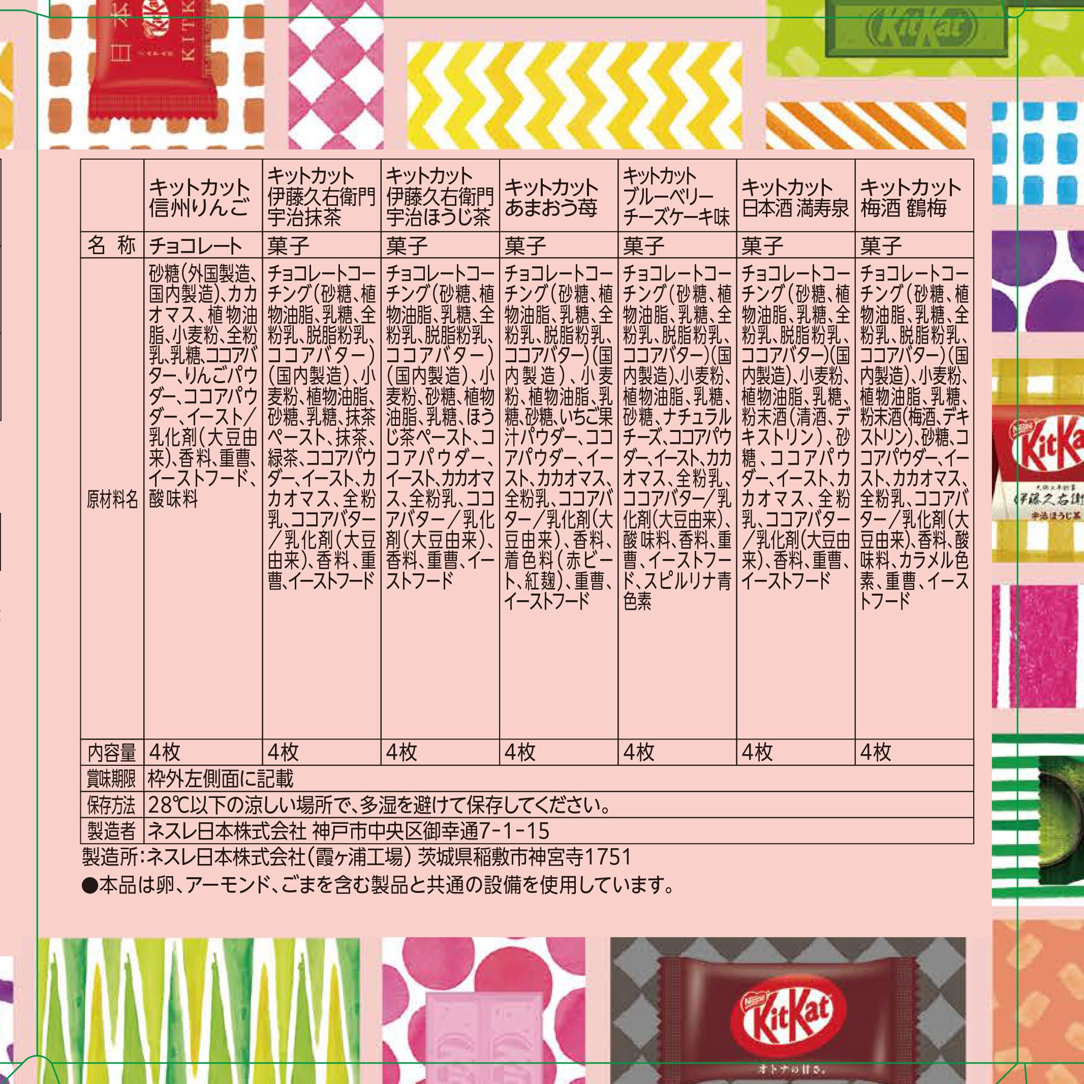 【キットカット ミニ】砂糖(外国製造、国内製造)、カカオマス、植物油脂、小麦粉、全粉乳、乳糖、ココアバター、ココアパウダー、イースト/乳化剤(大豆由来)、香料、重曹、イーストフード 【キットカット ミニ オトナノアマサ】砂糖(外国製造、国内製造)、植物油脂、ビスケット(小麦粉、砂糖、ショートニング、ココアパウダー、食塩)、小麦粉、カカオマス、全粉乳、乳糖、ココアバター、ココアパウダー、イースト/乳化剤(大豆由来)、膨脹剤、香料、重曹、イーストフード 【キットカット ミニ オトナノアマサ コイマッチャ】チョコレートコーチング(植物油脂、砂糖、乳糖、全粉乳、ココアバター)(国内製造)、小麦粉、ビスケット(小麦粉、砂糖、ショートニング、食塩)、植物油脂、砂糖、抹茶、乳糖、ココアパウダー、緑茶、カカオマス、全粉乳、イースト、ココアバター/乳化剤(大豆由来)、膨脹剤、香料、重曹、イーストフード 【キットカット ミニ ゼンリュウフンフビスケットIN】チョコレートコーチング(植物油脂、砂糖、乳糖、全粉乳、ココアバター)(国内製造)、全粒粉ビスケット(小麦粉、小麦全粒粉、砂糖、ショートニング、食塩)、小麦粉、砂糖、植物油脂、乳糖、ココアパウダー、カカオマス、全粉乳、イースト、ココアバター/乳化剤(大豆由来)、膨脹剤、カラメル色素、香料、重曹、イーストフード、酸化防止剤(ビタミンE) 【キットカット オトナノアマサ ストロベリー】チョコレートコーチング(植物油脂、砂糖、乳糖、全粉乳、ココアバター)(国内製造)、小麦粉、ビスケット(小麦粉、砂糖、ショートニング、食塩)、植物油脂、乳糖、砂糖、いちご果汁パウダー、乾燥いちご加工品、ココアパウダー、イースト、カカオマス、全粉乳、ココアバター/乳化剤(大豆由来)、酸味料、膨脹剤、香料、着色料(赤ビート、紅麹)、重曹、イーストフード 【キットカット ミニ カカオ72%】カカオマス(外国製造又は国内製造)、砂糖、小麦粉、ココアバター、ココアパウダー、植物油脂、乳糖、全粉乳、イースト/重曹、イーストフード、乳化剤(大豆由来)、香料【キットカット ミニ ショコラオレンジ】砂糖(外国製造、国内製造)、カカオマス、植物油脂、小麦粉、全粉乳、乳糖、ココアバター、オレンジ果汁パウダー、ココアパウダー、イースト/乳化剤(大豆由来)、香料、酸味料、重曹、イーストフード 【キットカット ミニ ミルクティー 】準チョコレート(砂糖、乳糖、植物油脂、全粉乳、ココアバター)(国内製造)、小麦粉、植物油脂、乳糖、砂糖、紅茶エキスパウダー、ココアパウダー、イースト、カカオマス、全粉乳、ココアバター/乳化剤(大豆由来)、カラメル色素、香料、重曹、イーストフード【キットカット シンシュウリンゴ】砂糖(外国製造、国内製造)、カカオマス、植物油脂、小麦粉、全粉乳、乳糖、ココアバター、りんごパウダー、ココアパウダー、イースト/乳化剤(大豆由来)、香料、重曹、イーストフード、酸味料 【キットカット イトウキュウエモン マッチャ 】準チョコレート(砂糖、乳糖、植物油脂、全粉乳、ココアバター)(国内製造)、小麦粉、植物油脂、砂糖、乳糖、抹茶ペースト、抹茶、緑茶、ココアパウダー、イースト、カカオマス、全粉乳、ココアバター/乳化剤(大豆由来)、香料、重曹、イーストフード 【キットカット イトウキュウエモン ホウジチャ】準チョコレート(砂糖、乳糖、植物油脂、全粉乳、ココアバター)(国内製造)、小麦粉、砂糖、植物油脂、乳糖、ほうじ茶ペースト、ココアパウダー、イースト、カカオマス、全粉乳、ココアバター/乳化剤(大豆由来)、香料、重曹、イーストフード 【キットカット アマオウイチゴ】準チョコレート(砂糖、乳糖、植物油脂、全粉乳、ココアバター)(国内製造)、小麦粉、植物油脂、乳糖、砂糖、いちご果汁パウダー、ココアパウダー、イースト、カカオマス、全粉乳、ココアバター/乳化剤(大豆由来)、香料、着色料(赤ビート、紅麹)、重曹、イーストフード 【キットカット ストロベリーチーズケーキ 】準チョコレート(砂糖、乳糖、植物油脂、全粉乳、ココアバター)(国内製造)、小麦粉、植物油脂、砂糖、乳糖、ナチュラルチーズ、ココアパウダー、イースト、カカオマス、全粉乳、ココアバター/乳化剤(大豆由来)、香料、重曹、イーストフード