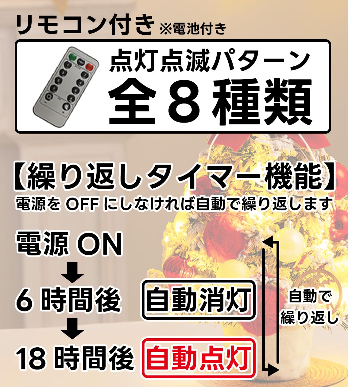 【8種類の点灯モードとタイマー機能付き】連続点灯や波状など8種類の点灯モードからお好みで操作して光らせることができます。シーンに合わせてお楽しみくださいまた、うれしいタイマー機能も付いているので消し忘れや毎日、点灯・消灯をする手間がかかりません。