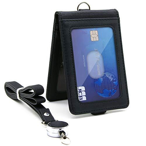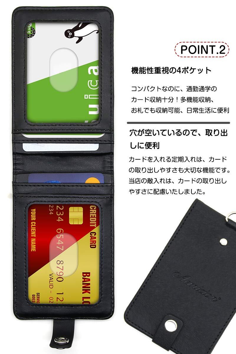 [Aemicion] 定期入れ IDカードホルダー パスケース ネームホルダー icカードケース リール/クリップストラップ付き 革 レザー 二面 メンズ レディース 通勤 通学 ブラック 1個