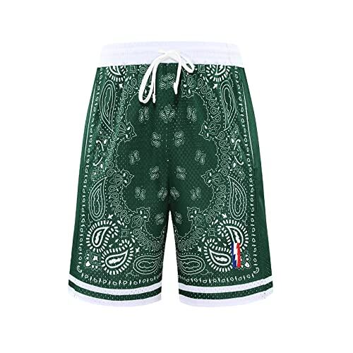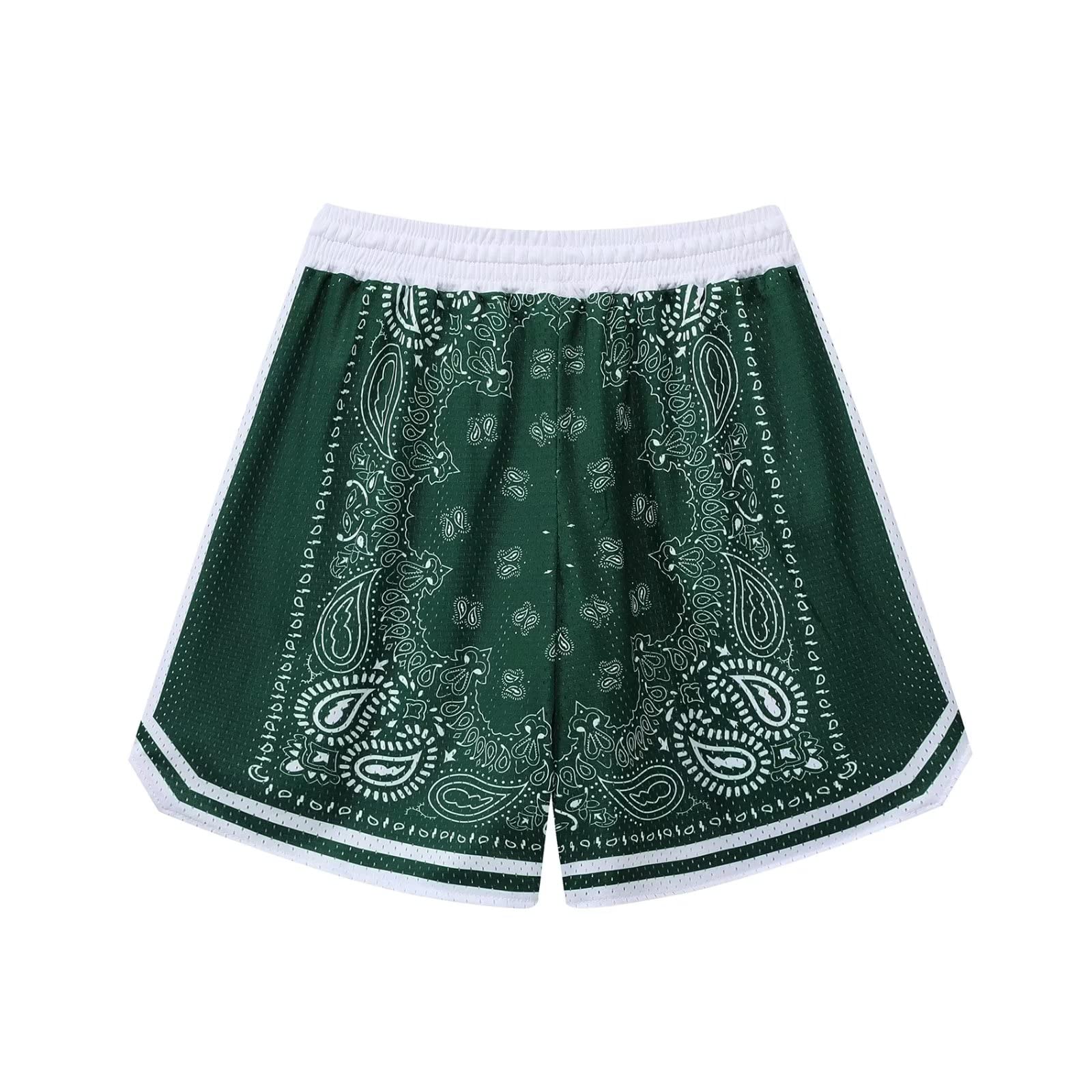 [OROLN] バスケットパンツ メンズ スポーツ アメリカン短パン ペイズリー柄 ウェア ランニング トレーニング ショートパンツ ポケット付き ウエスト 調整可能 速乾 通気(グリーン(ペイズリー柄)-S)