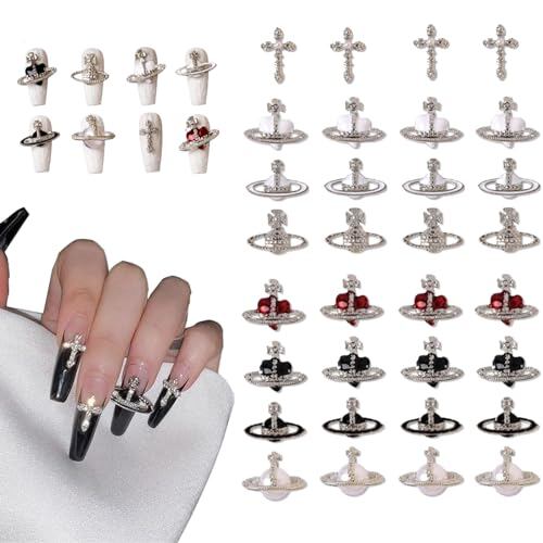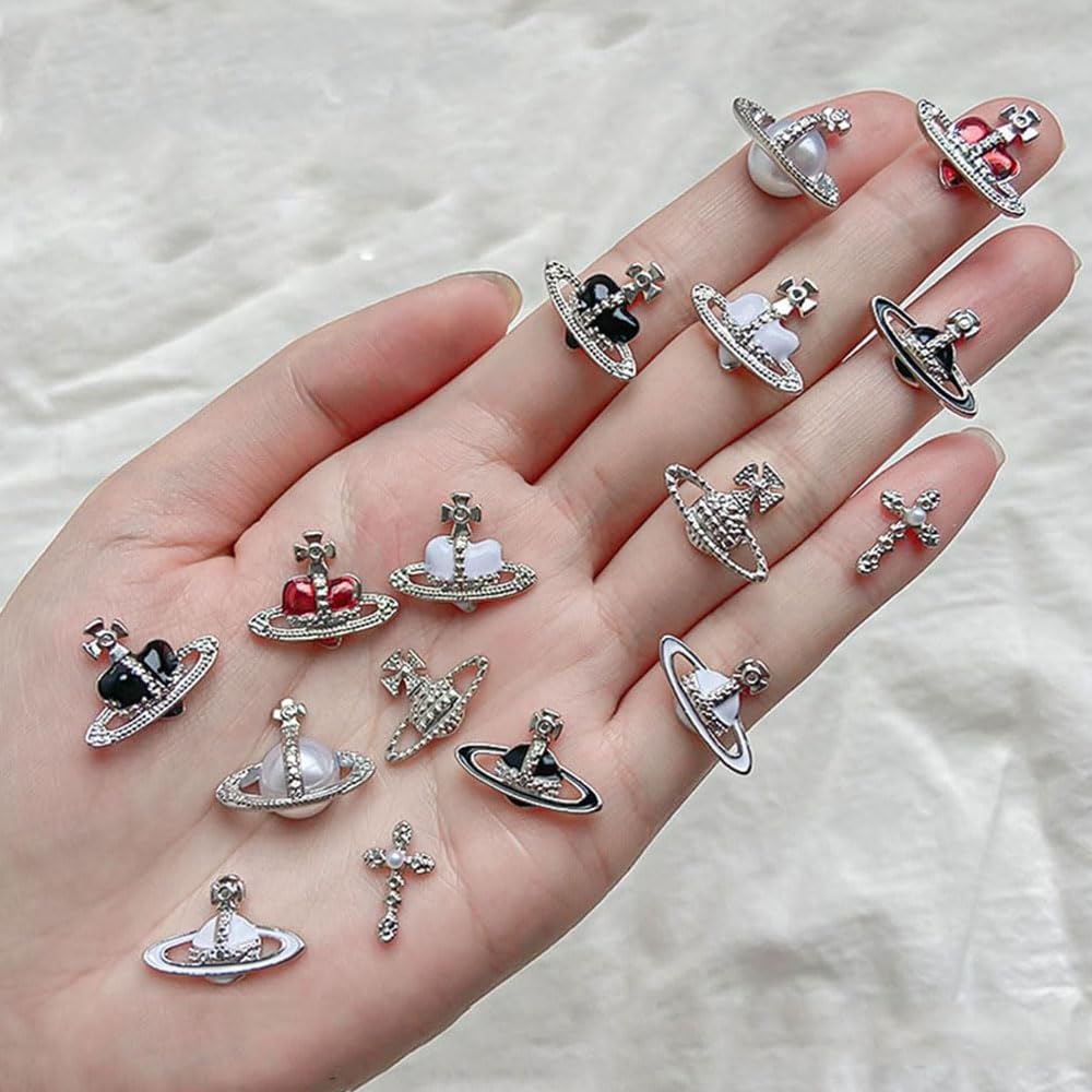 【パッケージ内容】ネイルパーツ約32個セット。十字架、ハート、惑星、真珠など8種類のデザインがあり、各種類4個ずつ。