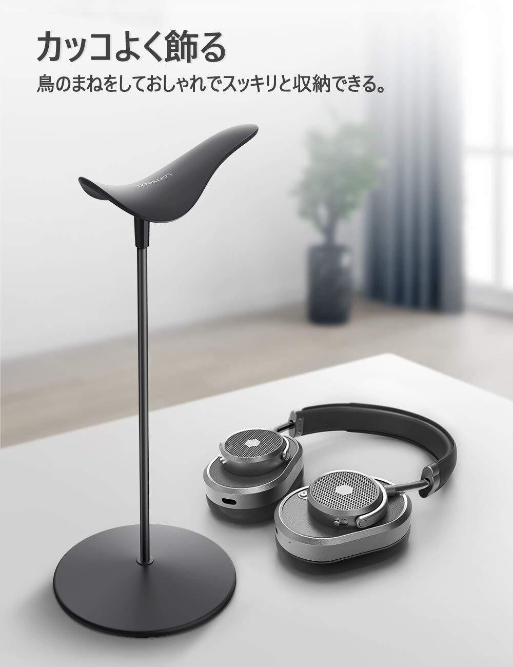 【収納対策】すっきりとした外観でスペースをほとんど取らず、卓上にヘッドホンを収納できて非常に便利です。軽量で頑丈、シンプルながら存在感のあるヘッドホンスタンドです。机上にヘッドホンスタンドを置くスペースがないと困っている方にお勧めします。