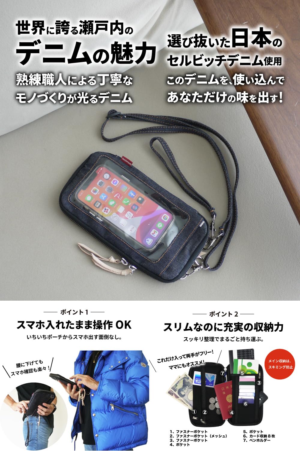 【デニム好きには、たまらない】あなただけの色落ちを楽しむ。スマホポーチ 入れたまま操作スマホ入れたまま操作OK ▶︎いちいちポーチからスマホ出す面倒なし。スリムなのに充実の収納力 ▶︎スッキリ整理でまるごと持ち運ぶ。メイン収納はスキミング防止機能。使いやすい最強の財布▶︎ダブルファスナーが秀逸。使いやすいように開け方を決めることができる。肩掛け3パターン ▶︎オシャレで便利で飽きがこない。肩ひも調整で楽しむ ▶︎シーンやコーデに合わせてピタッと決める。