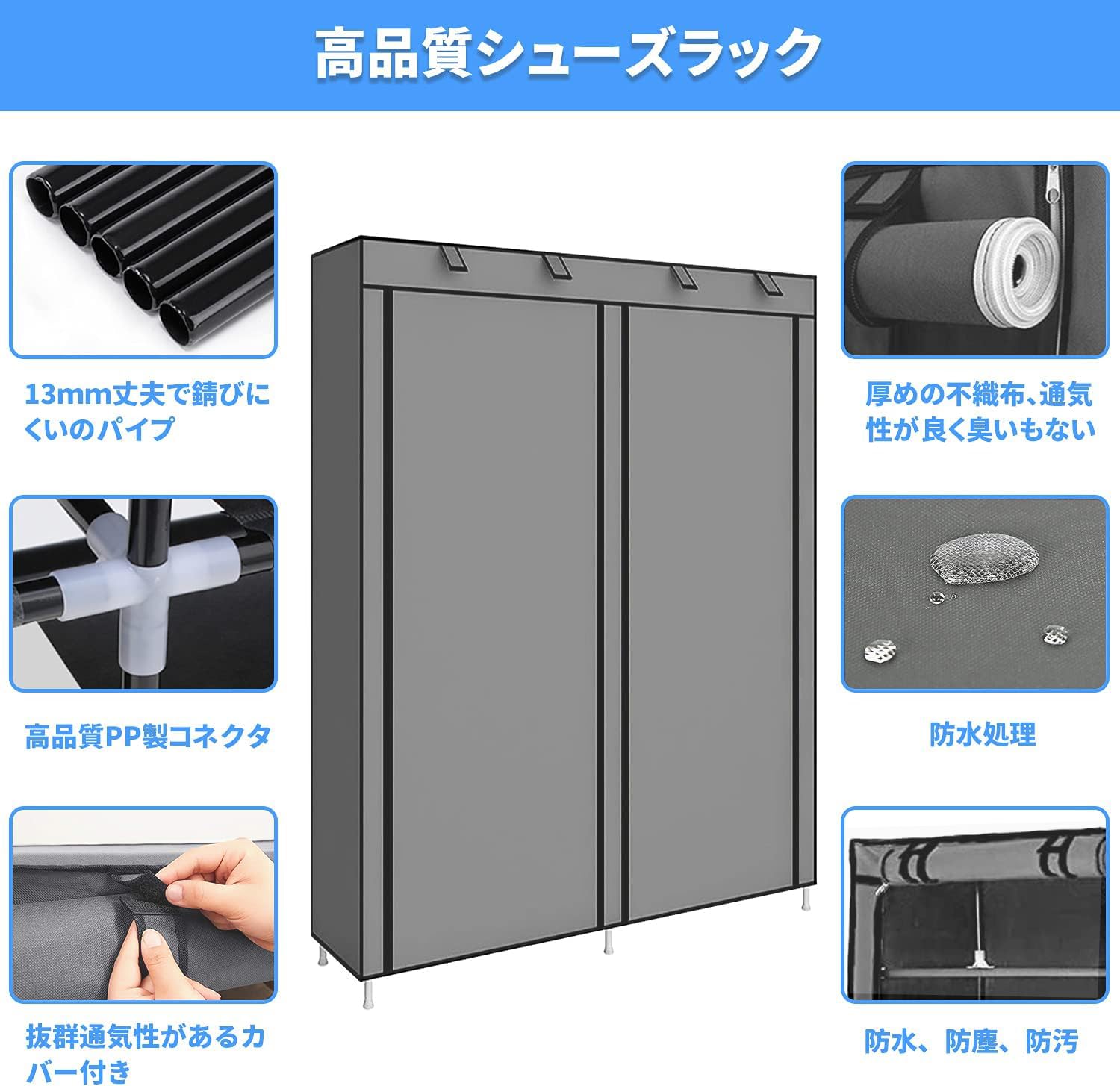 【高品質シューズラック】: 1.パイプ - 直径13mmのプラスチックをコーティングした太い鉄パイプ、防錆、丈夫で長持ち、耐荷重能力が優れるなどの特徴があり、長く使っても変形しにくいので、安心してご利用いただけます。2.埃やカビやダニから靴を守る不織布カバー付きで、来客時の目隠しにも最適です。靴の収納に関する様々な悩み一気に解決!3.ジョイント - 高強度環境配慮型PPプラスチック材料で作られ、耐摩耗性、安定性が優れたから、パイプをしっかり支え、横揺れしないようにします。