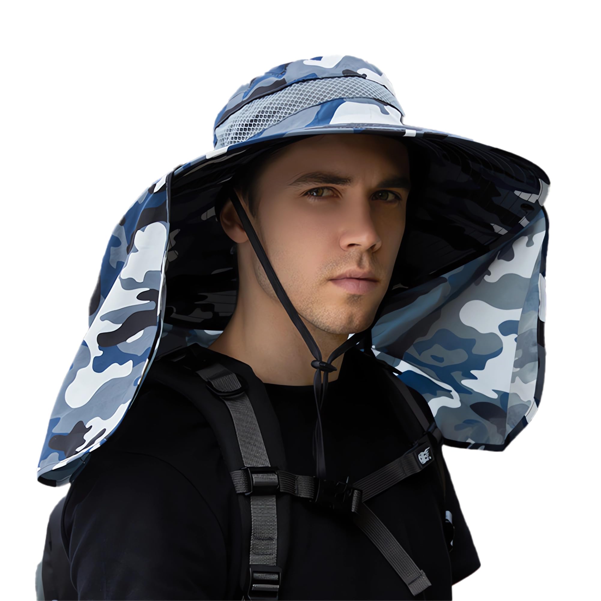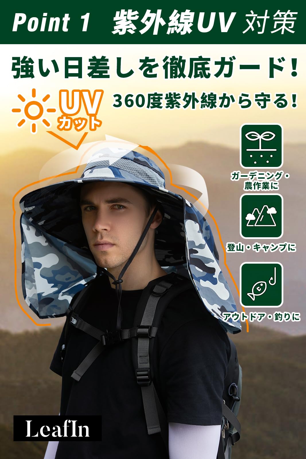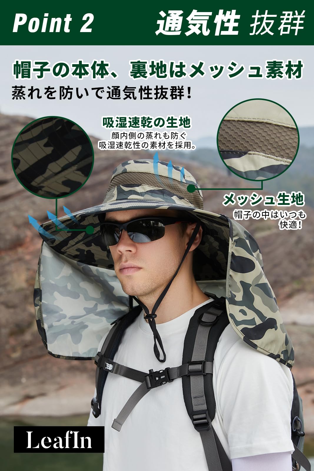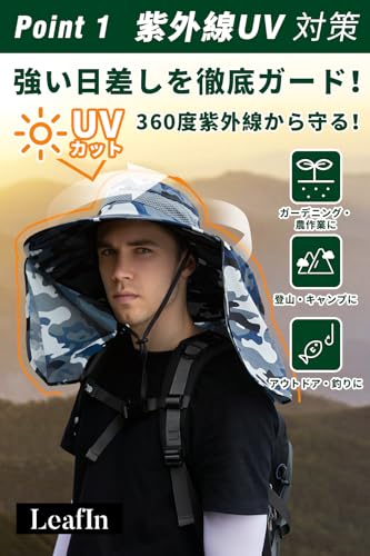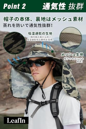 [LeafIn] フィッシングハット サファリハット つば広 帽子 シェードハット メンズ メッシュ UVカット カモフラハット カモフラージュ ジャングルハット 日焼け防止 2way 釣り 登山 アウトドア 9208(③)
