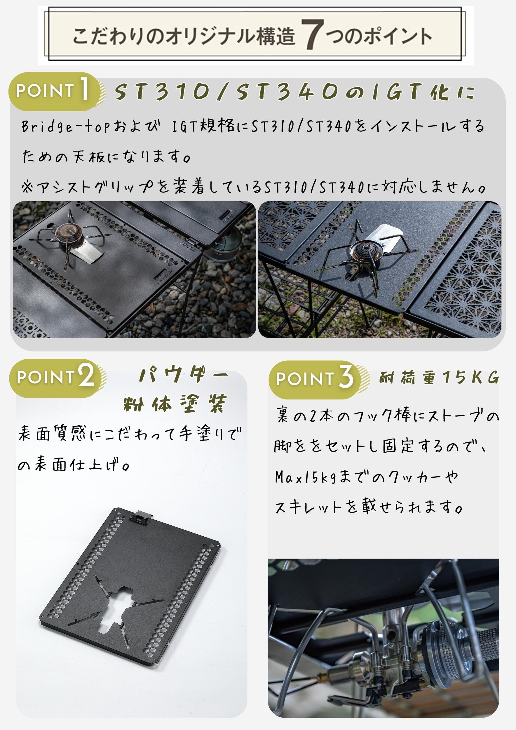 ※塗装品ですので硬い物にあてたり擦れたりすると、剥がれや傷が生じます。※IGT規格テーブルは寸法差がメーカーによってありますので、ご購入前に必ず寸法をご確認下さい。※ST310の元栓が天板の下方に取り付けされることにより、操作が通常と比べ、やや難しくなります。機能拡張に伴う不便さを感じる場合がございますので、予めご了承ください。 ※経年による五徳の変形で天板に水平に置けない報告がございます。その場合は、五徳を微修正してからセットしいただく必要がございます。