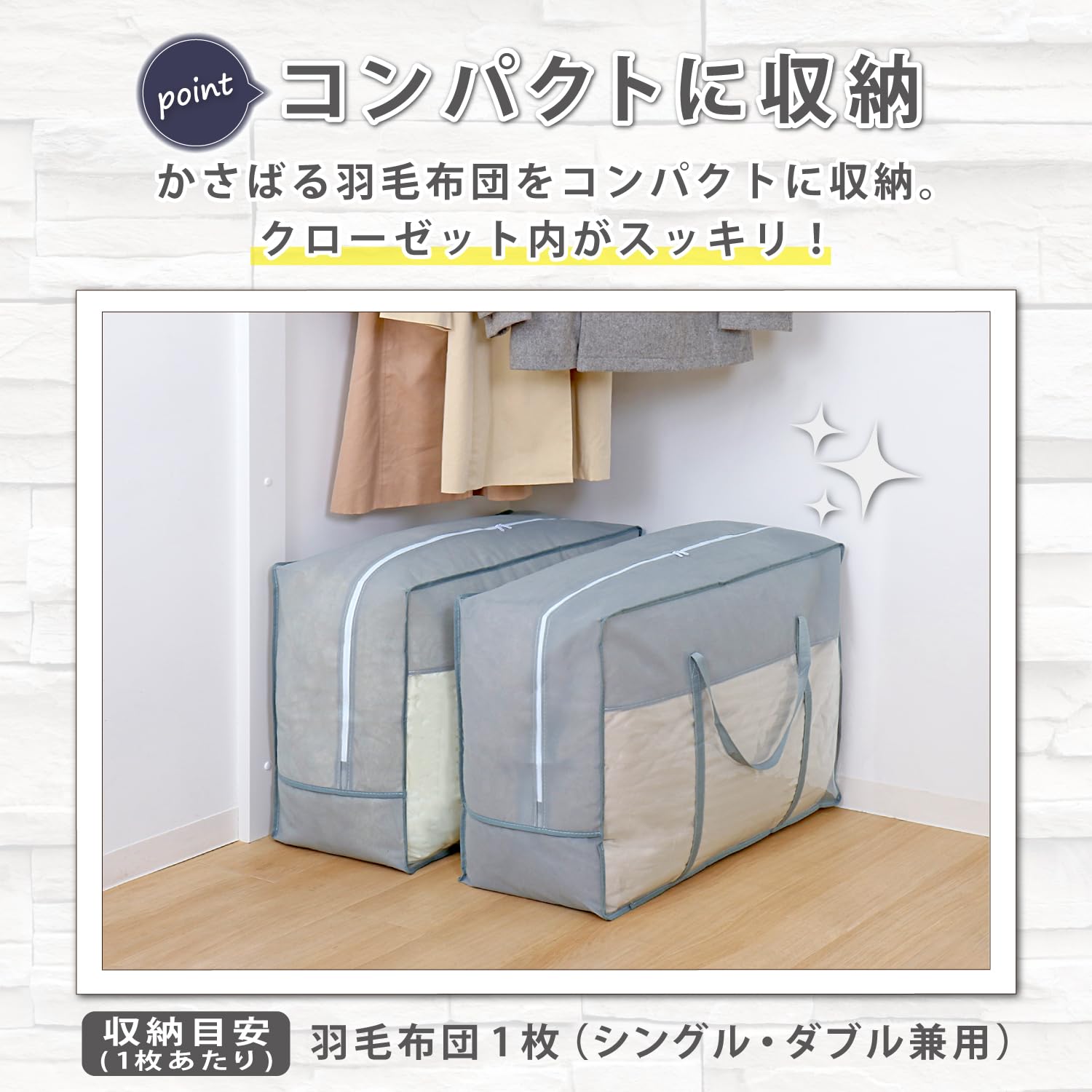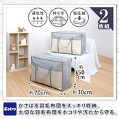 【商品仕様】:サイズ/約幅70×奥行30×高さ50cm、カラー/グレー、内容/2枚、収納目安(1枚あたり)/シングルサイズもしくはダブルサイズの羽毛布団1枚、材質/ポリプロピレン・ポリエチレン