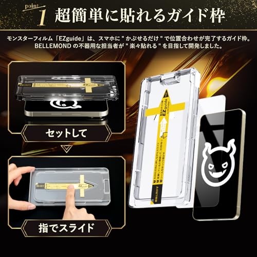 【カチャ、スー、パカッだけの簡単貼り付け】モンスターシリーズの「EZguide - イージーガイド - 」はガイド枠とガラスフィルムが一体型になった「ガイド枠一体型」貼り付けキットです。画面にガイド枠をかぶせるだけで、誰でも簡単に位置ズレのなく貼り付けが可能です。今までの貼り付け方に戻れないほど「簡単」で「貼りやすい」EZguideをぜひお試しください。
