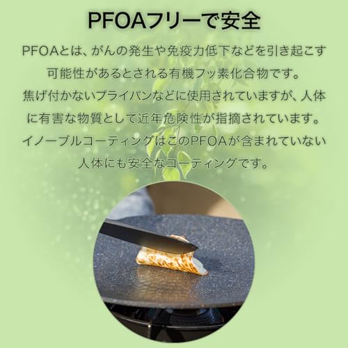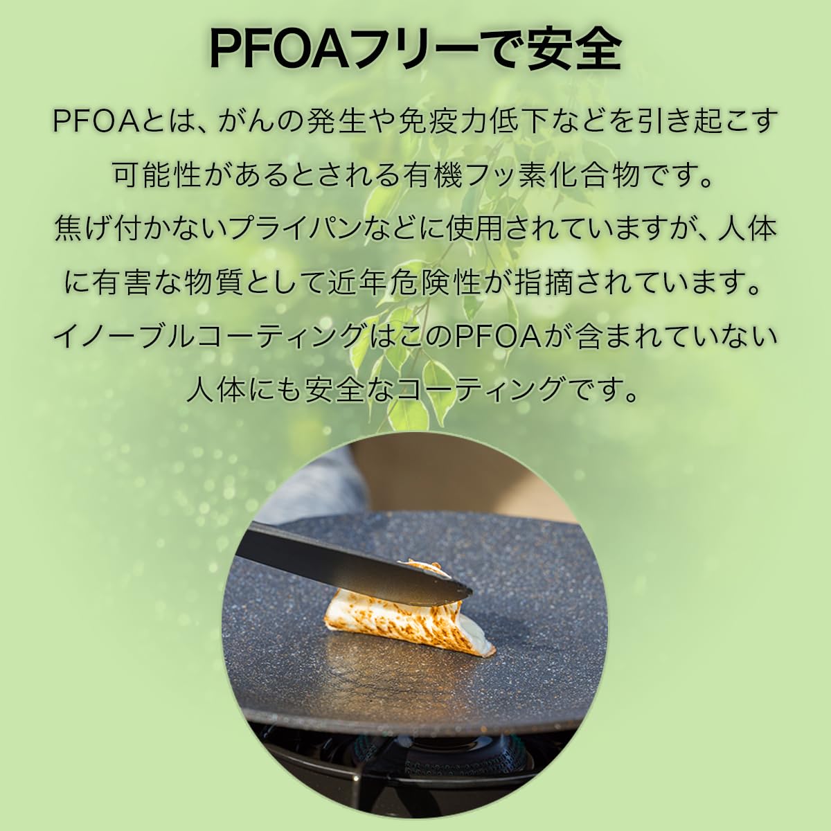 【面倒なシーズニング不要 油なしでも焦げ付かない!】 イノーブルコーティングという特殊なコーティングで油なしでも焦げ付かないので、調理中も快適です。キズやサビ、摩擦にも強く、シーズニングも不要なのでお手入れ簡単です。 【PFOAフリーで安全】 PFOAとは、がんの発生や免疫力低下などを引き起こす可能性があるとされる有機フッ素化合物です。イノーブルコーティングはこのPFOAが含まれない人体にも安全なコーティングです。