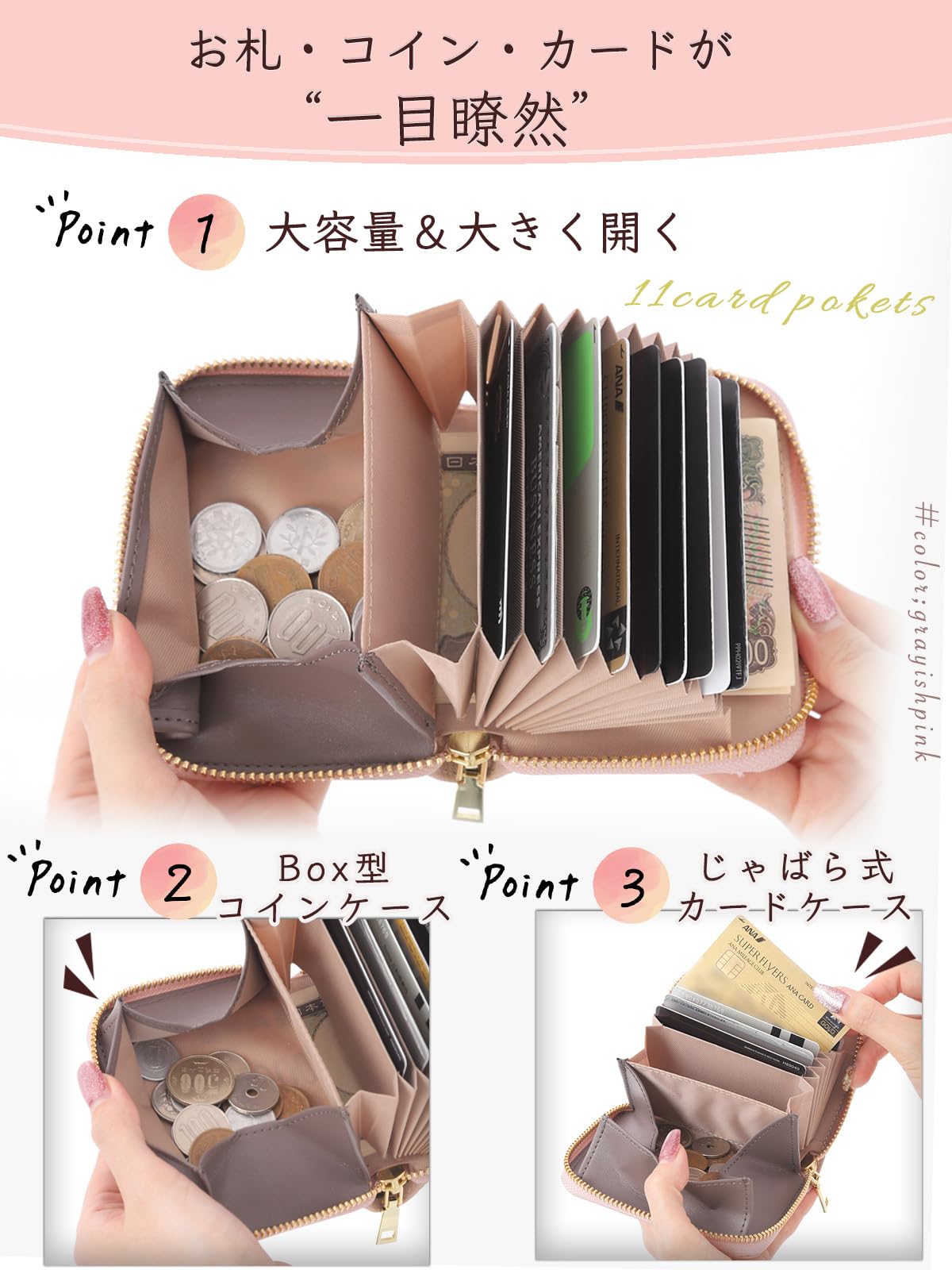 【One アクションで支払いを】お札、小銭、カードが一つのファスナーを開けるワンアクションで全て行えるミニ財布です