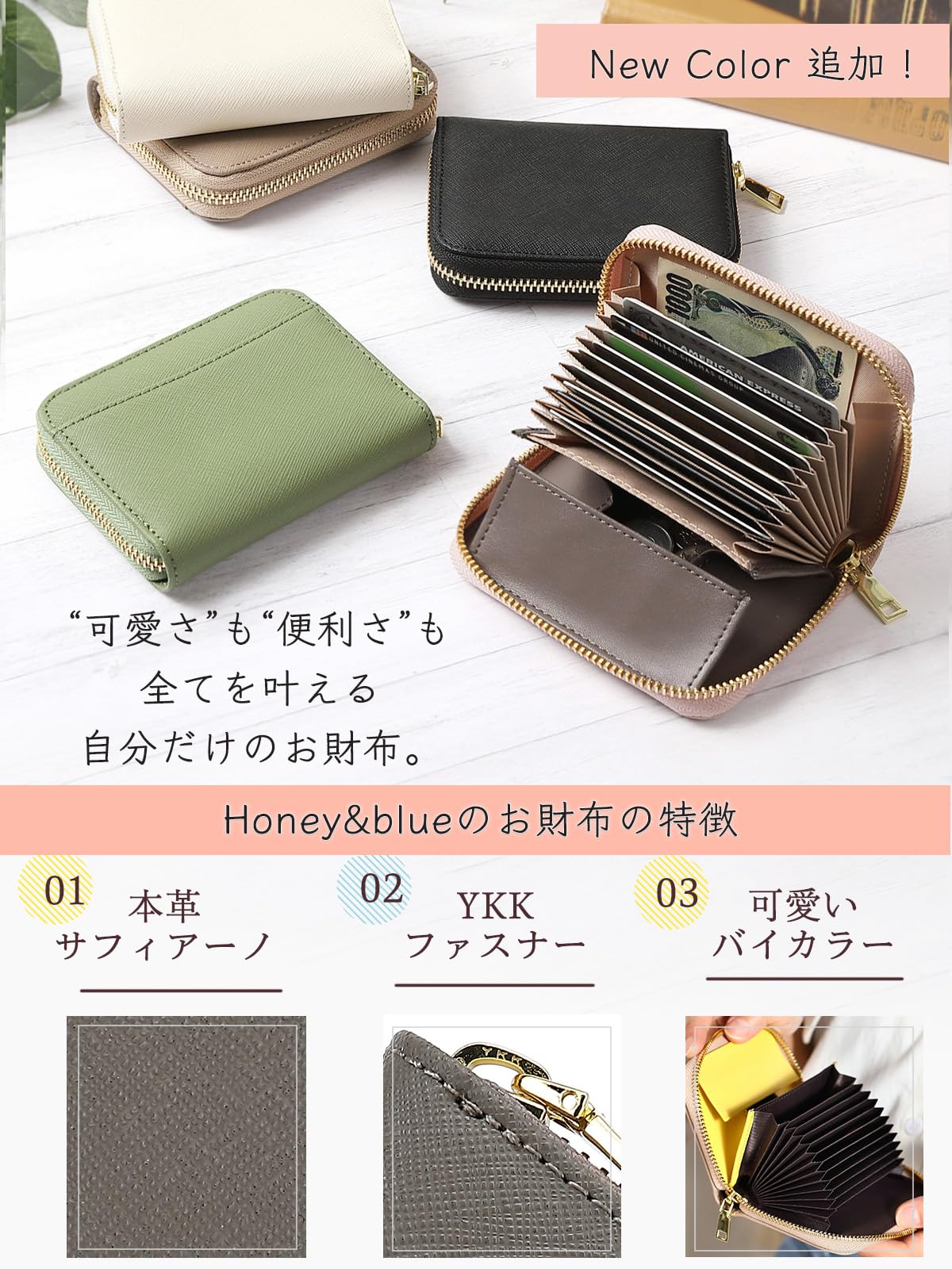 【本革サフィアーノレザー】ハイブランドでよく使われる本革サフィアーノレザーを使用しています。硬めのさらっとした肌触りが特徴で、傷や汚れに強く安心感のあるレザーです。中のレザーは色味を変えて、「財布を開けるたび新しい、楽しい気持ちになれるように」企画しました。