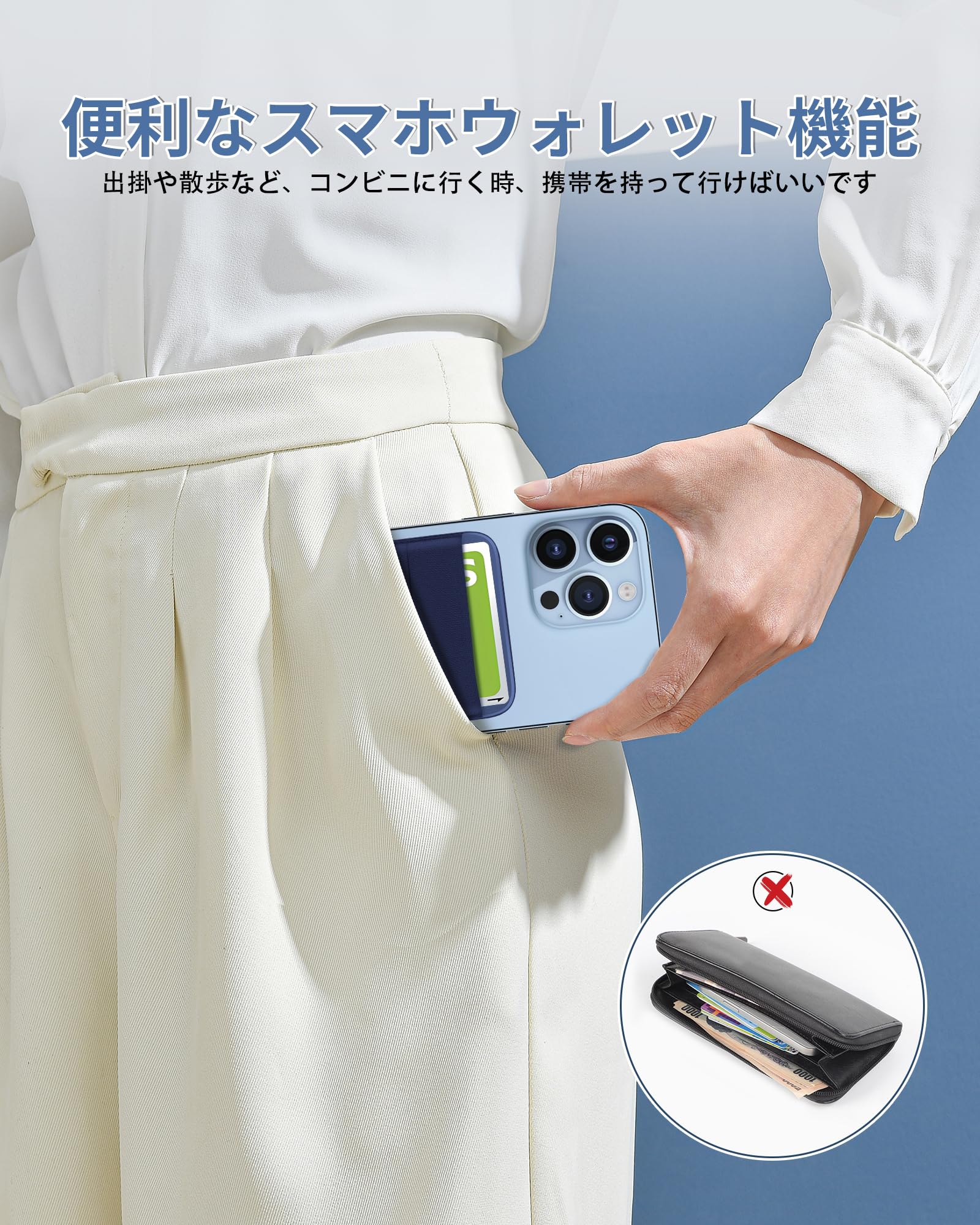 【スマホウォレット&カード収納安心】伸縮性に優れたスパンデックス素材を採用する。最大7枚のカードを入れることができます。フルーカバーカードケースデザインで、カード1枚だけ入れても落ちる心配がありません。カードを1∼3枚入れる時はとても軽くて持ち運びに便利です。