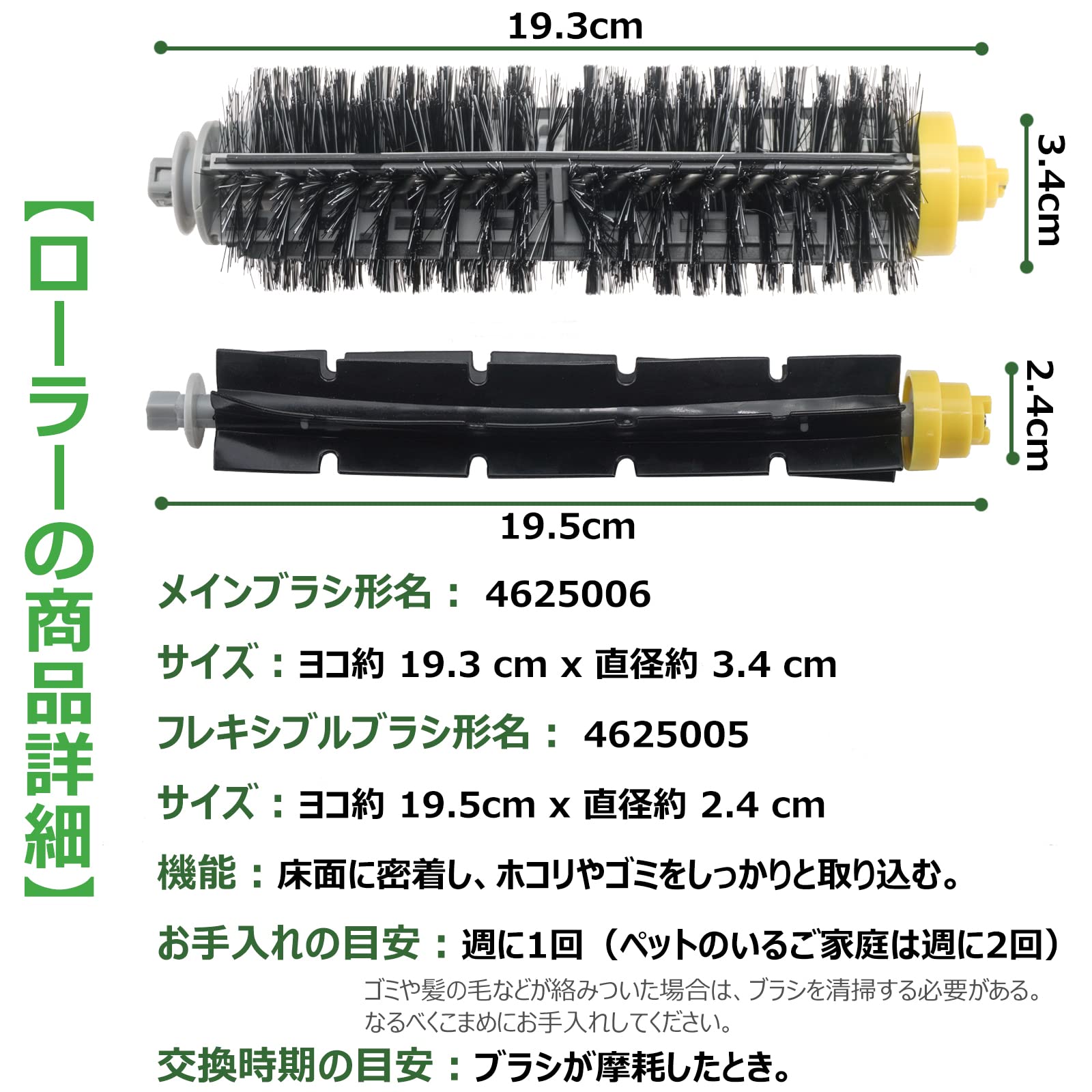 【お手入れ目安】フィルター、メインブラシ、フレキシブルブラシは週に1回(ペットのいるご家庭は週に2回)。エッジクリーニングブラシは1か月に1回。ロボット掃除機の清掃能力を最適に保つために、定期的にお手入れしてください。吸引力が低下したら、ダスト容器を空にして、フィルターやブラシを清掃してください。