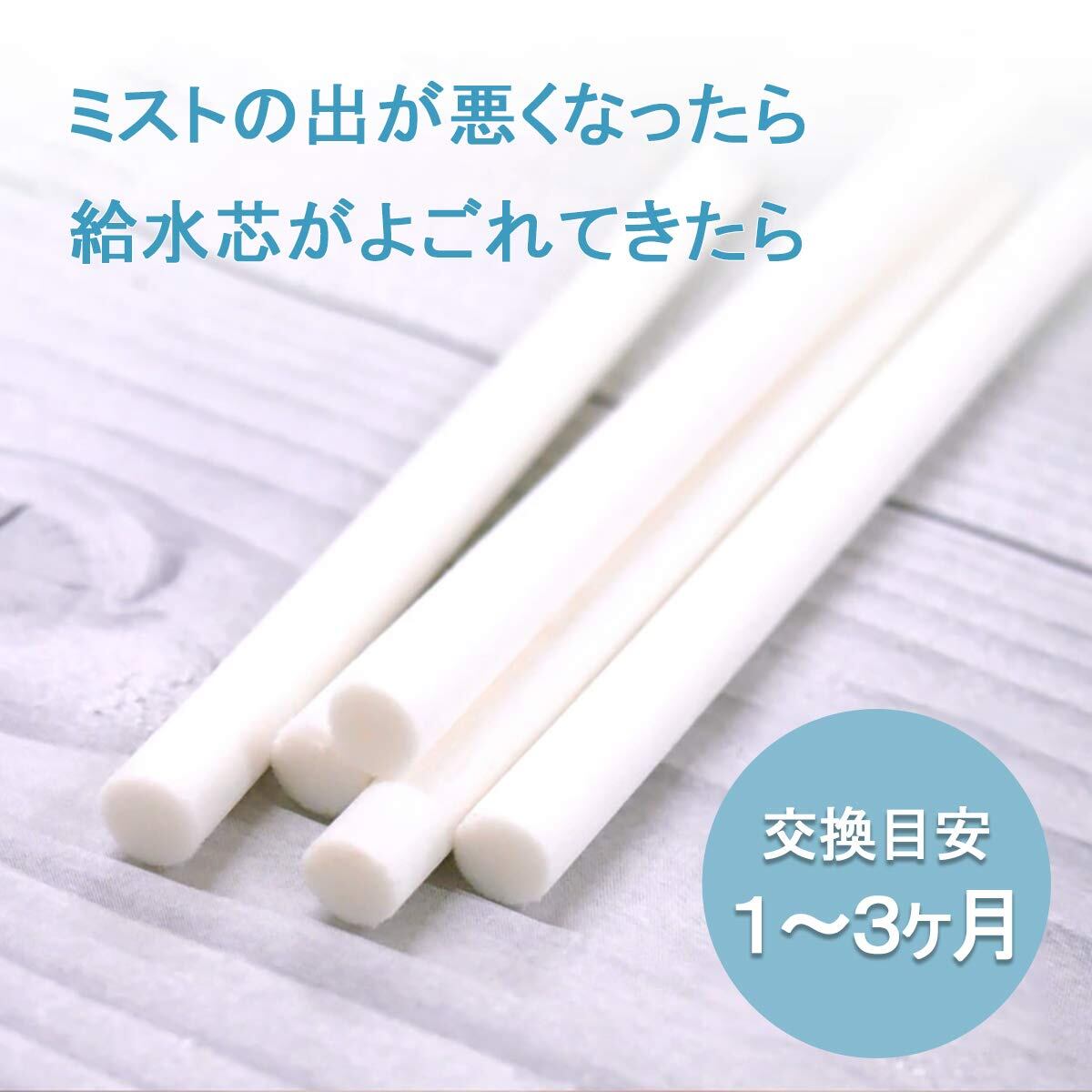 【充分な10本セット】交換目安が3~6ヶ月(1日4時間使用する場合)ですが、使用時間が長くお手入れもめったしないと給水芯の吸水力が低下しカビが生えてしまいますので、その場合は1~2ヶ月で交換するのが望ましいです。
