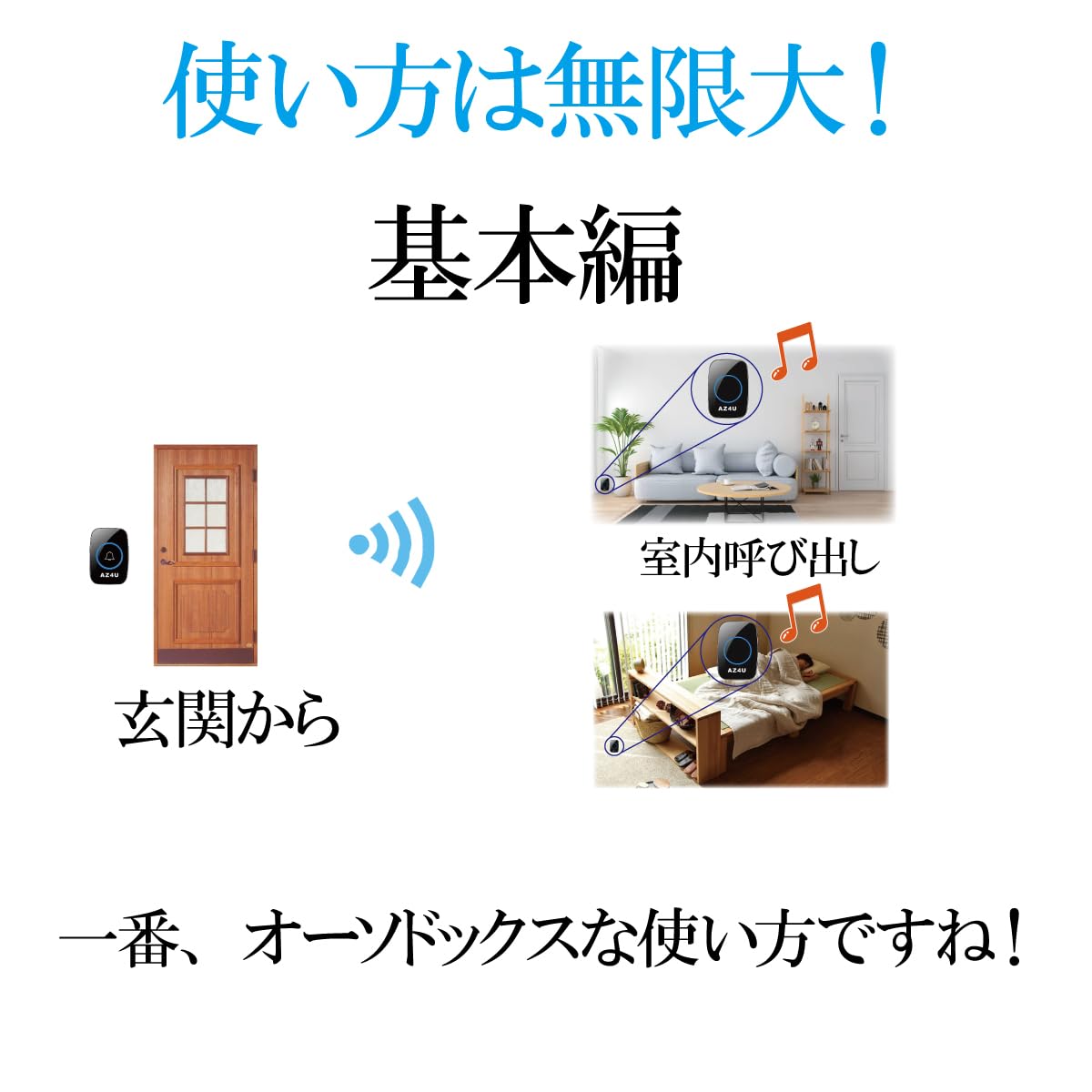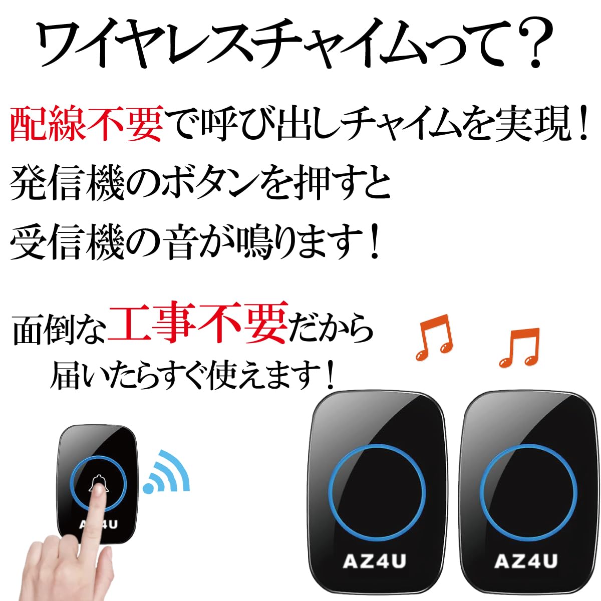 商品名:AZ4Uワイヤレスチャイム | お勧め利用法:無線転送距離:最大300M | メロディ:全60メロディ | 音量:音量調節可能 4段階音量調整 | カラー:ブラック/ホワイト | 給電方式:発信機-12V23A電池(付属)(試供品となります。早めにご交換ください。新品の電池の場合は3年ほど持続する仕様ですが、環境によって1年程度になる事もございます。)受信機-単3電池×3(別売り) | 防水:IPX4級防水 | 発信機の取付:両面テープ/ネジ固定 | 音声通話機能無し|