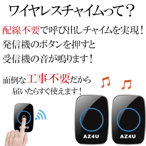 AZ4U ワイヤレスチャイム インターホン 電池式 ドアベルキット 技適マーク取得済み 工事不要 防水 玄関 介護 呼び出し (ブラック 受信機2個)