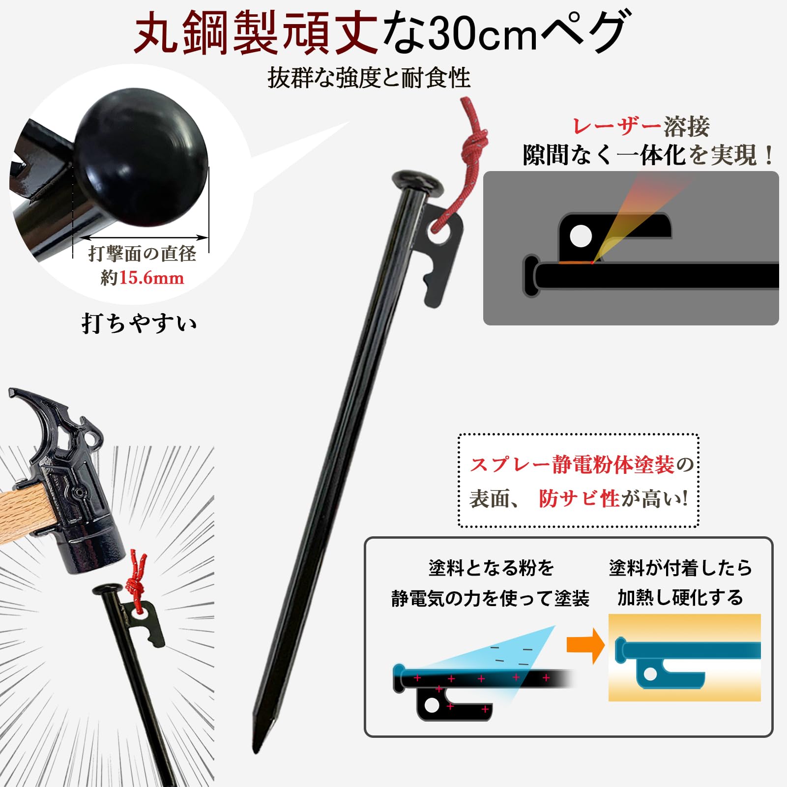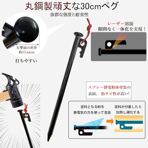 【材質】:丸鋼 (抜群な強度と耐食性) 【サイズ】:長さ(25cmと30cm)、直径(約)10mm 【重さ】: 25cm (約)157g/本、30cm (約)186g/本 【セット内容】:ペグと自在金具と収納ケース