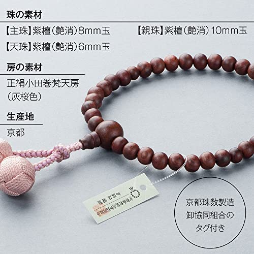 [仏壇屋 滝田商店] 数珠 女性用 紫檀 (艶消) 8mm玉 正絹小田巻梵天房 数珠袋付き すべての宗派で使える 京念珠 証明書付