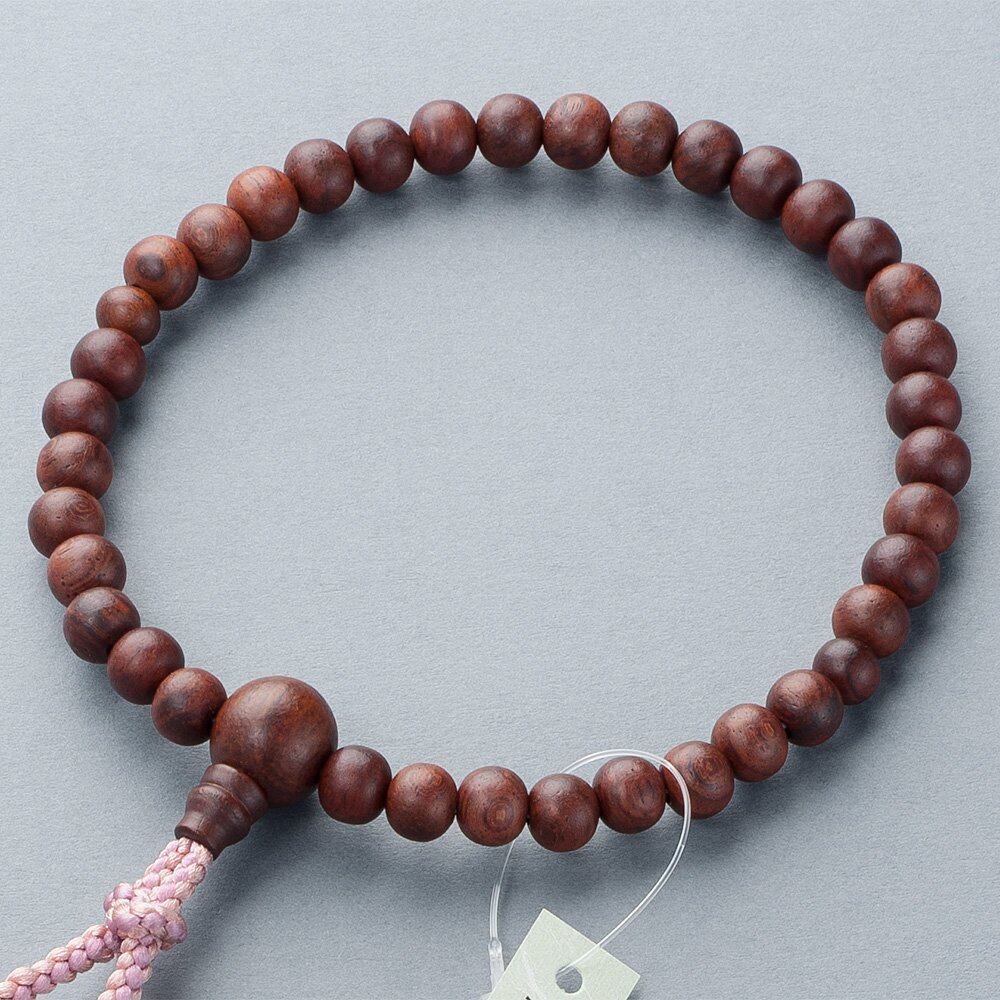 硬く耐久性に優れた紫檀を使用した女性用の念珠です。紫檀は正倉院御物の唐木細工にも多く使われ、古くから珍重されてきました。