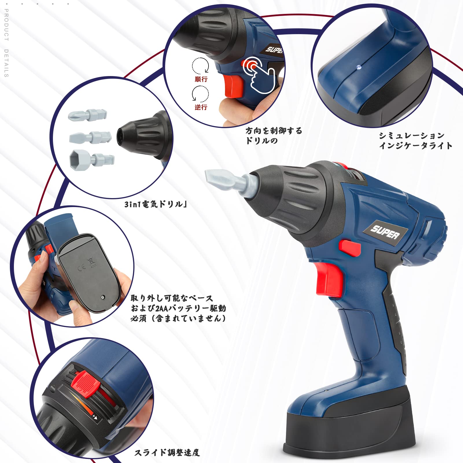 【子供 おもちゃ 工具 収納】電子玩具ドリル(2 * AA電池が必要、含まれていません)は、たちにとってより魅力的な、リアルなサウンドとアクションとライトを実現します。さまざまな機能のための3つの交換可能なドリルビットを装備。