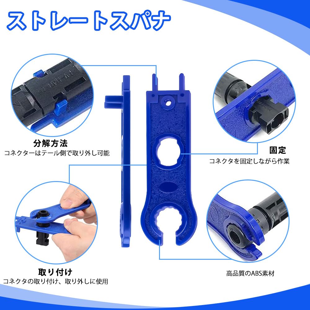 【幅広い用途】:ソーラーコネクタレンチは多くのコネクタに適しており、ソーラーパネルの太陽光発電ワイヤー、太陽光発電ケーブル、ソーラー発電機、ソーラーワイヤーコネクタなどを延長するために広く使用されています。
