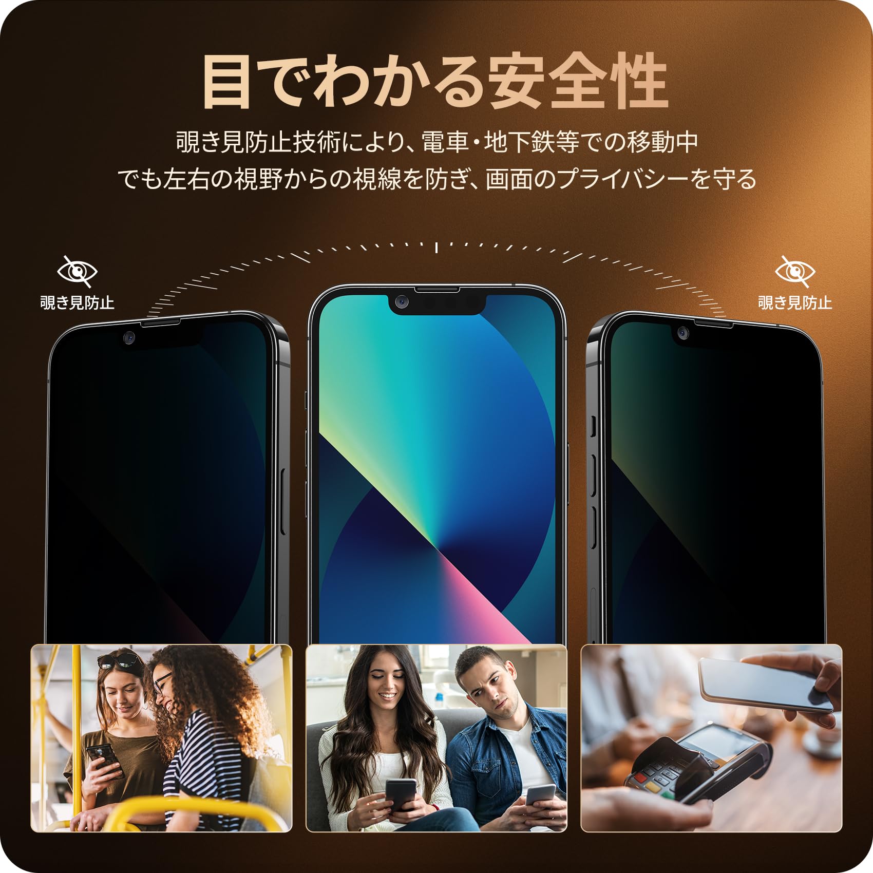 【覗き見防止仕様】覗き見防止技術により、左右の視野からの視線を防ぎ、画面のプライバシーを守ります。例えば、電車やバスの中でメッセージを見ていたら、隣の人に覗かれていたという心配がなく、LINEやメール操作の際も安心です。また、本製品は斜めから見るとブラインドルーバーにより画面が真っ黒になりますが、真正面から見ると高透過率ではっきり見ることが出来ます。