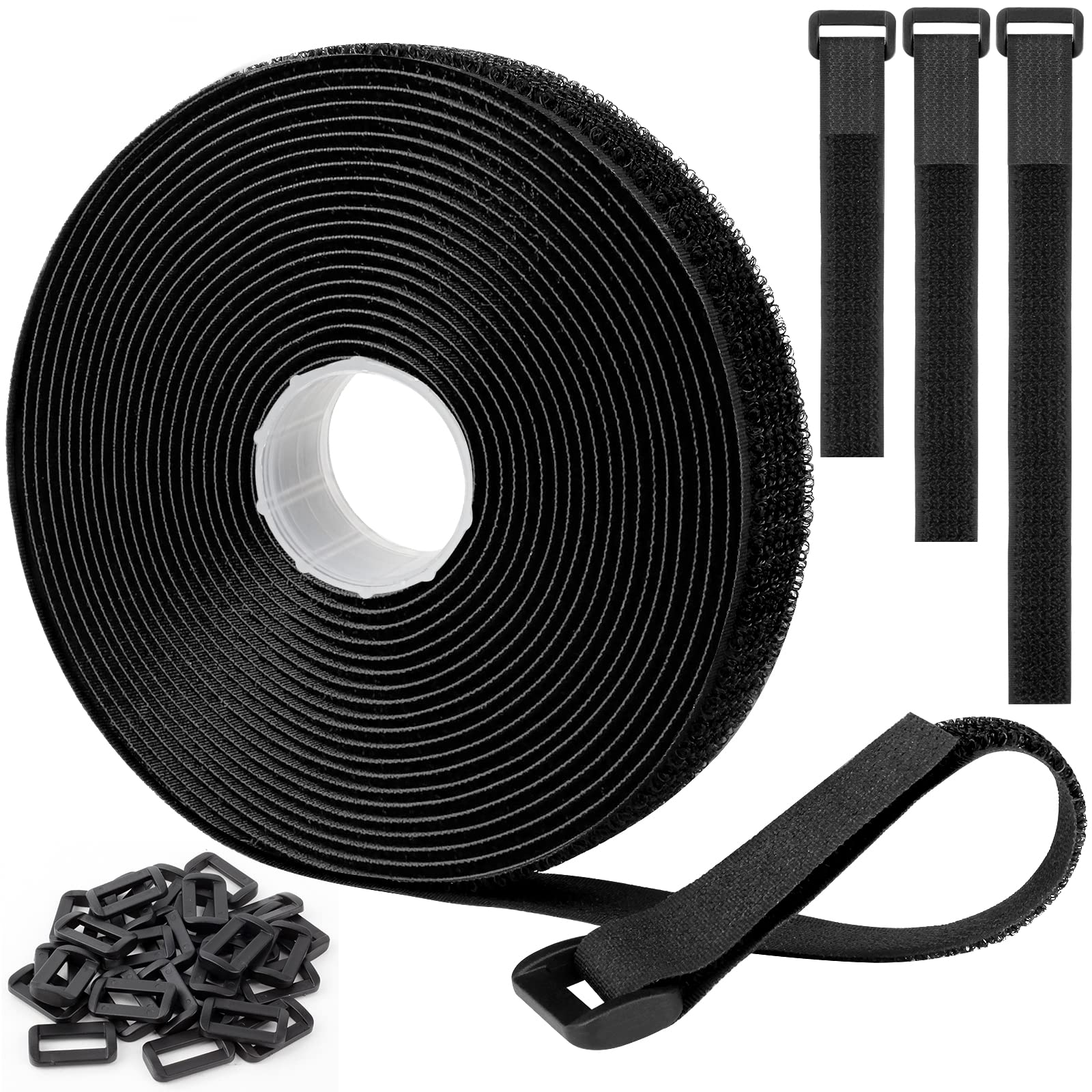 【6M荷締めベルトと30個バックル】幅20mmの締めベルトと30個のプラスチックバックル。ベルクロは6mロールから任意の長さにカットし、プラスチックバックルを接続してループを形成し、耐荷性が高くて、再利用可能です。