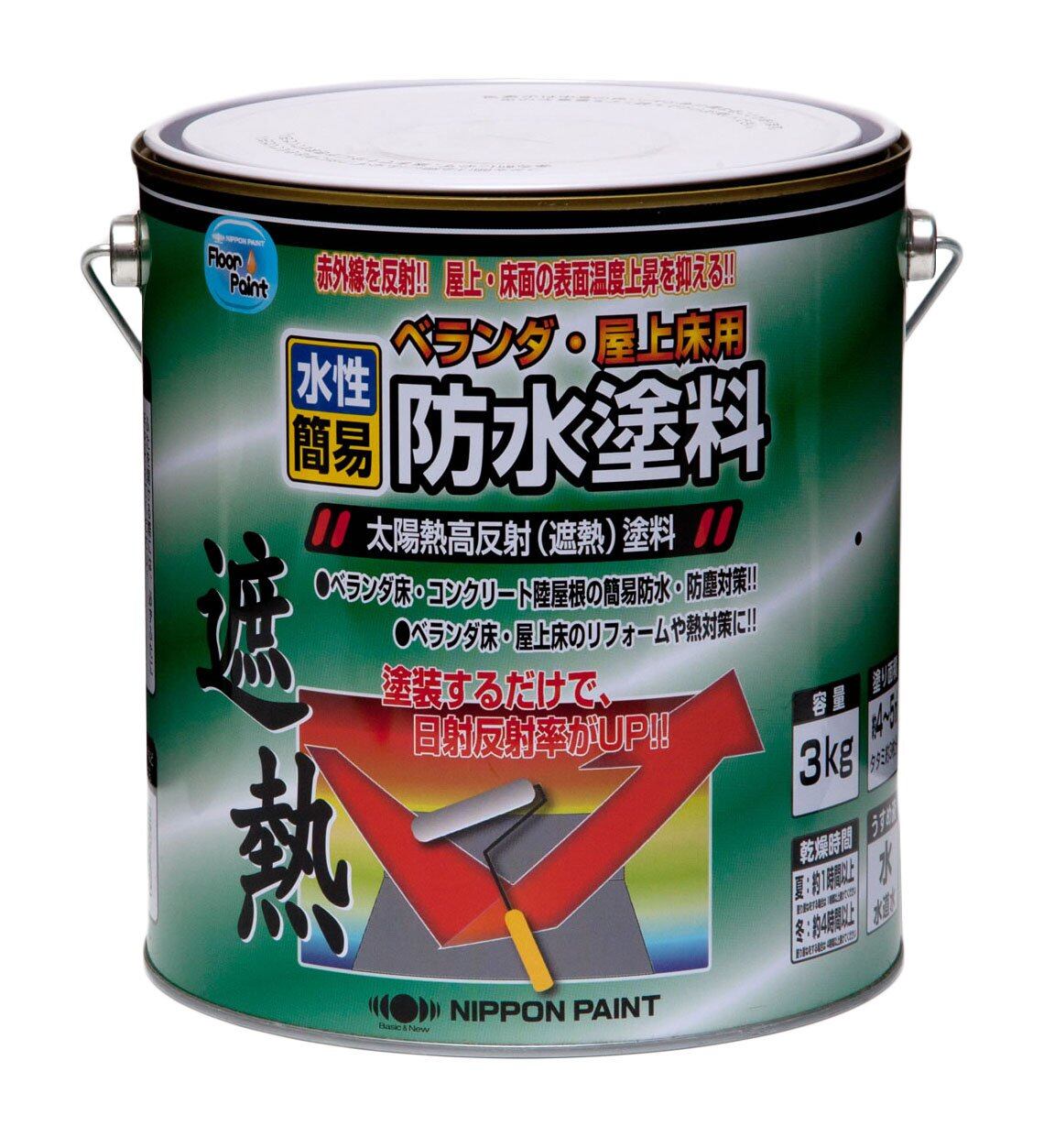 【特徴】本製品は「遮熱性能下塗りシーラー」と組み合わせて使用することで、遮熱効果を十分に発揮します。 耐水性、耐アルカリ性、耐候性、耐久性にすぐれた簡易防水塗料です。 赤外線を反射させ、屋上・床面の表面温度上昇を抑えます。 すべり止め剤配合。 一液型の反応硬化形水性塗料で、商品の取扱いが簡単です。