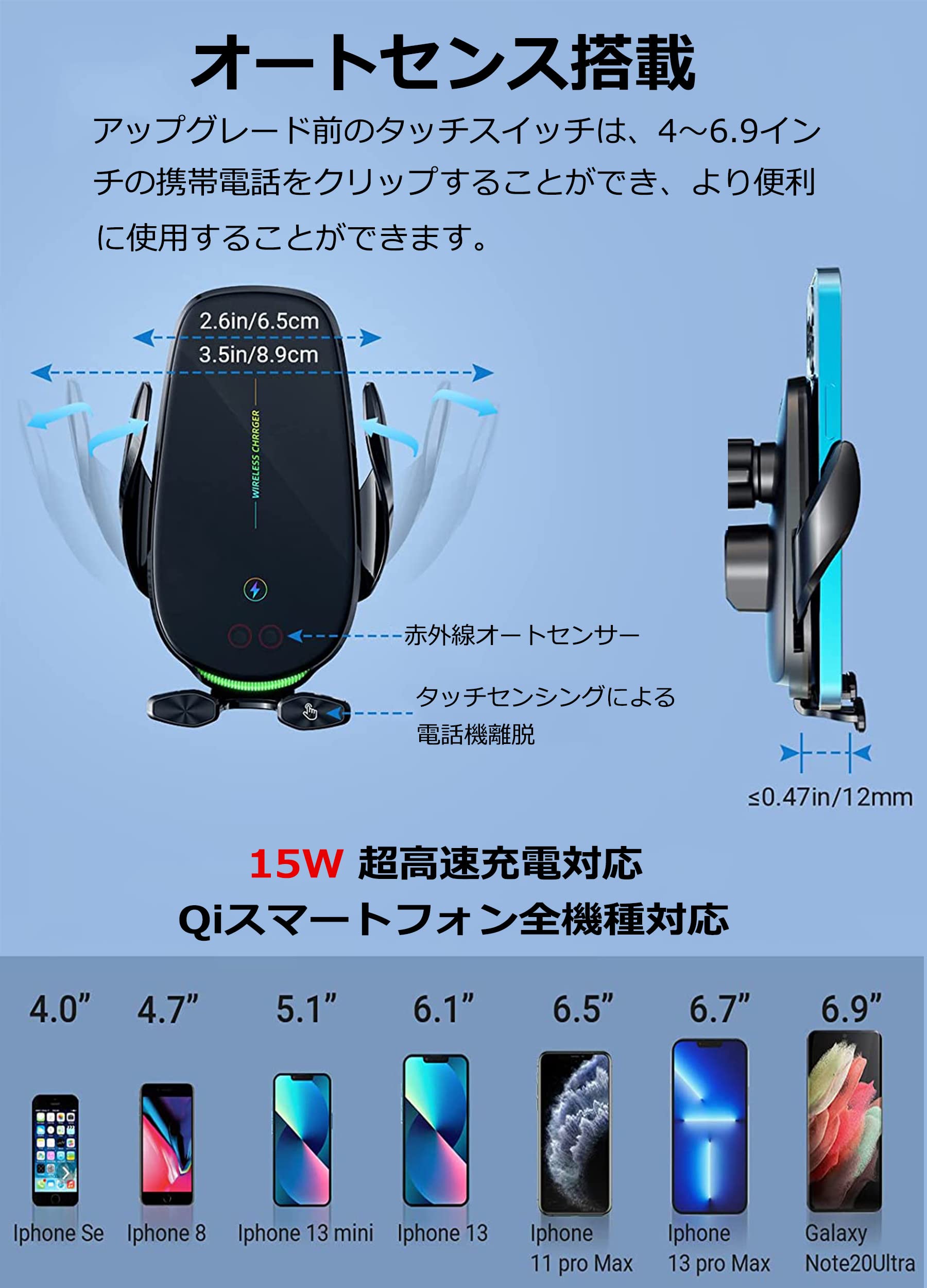 15W高速ワイヤレス充電:15W高速ワイヤレス充電ホルダーはLG G7 ThinQ V30+、Huwei Mate20 Pro/Mate20 RS/P30 Pro/P40 Pro、XiaoMI: MIX2S/MIX3 / NI9/10、IPhone 13/ 13 Mini/ 13 Pro/ 13、Pro Max/ 12/ 12 Pro/ 12 Mini/ 11/ 11 Pro/ 11 Pro Max/ Xs/ Xs Max/ Xr/ X/ 8、適用Samsung Galaxy S22/ S21 Ultra/ S21 Plus/ S21/ Note 20 Ultra/ Note 20/ S20/ S20 Plus/ S10 Edge/ Note 10 Plus/ S9 Plus/ S9/ Note 8/ S8 Plus/ S8/ S7 Edge/ Note 5/ S7/ Note 7の高速ワイヤレス充電を対応します。