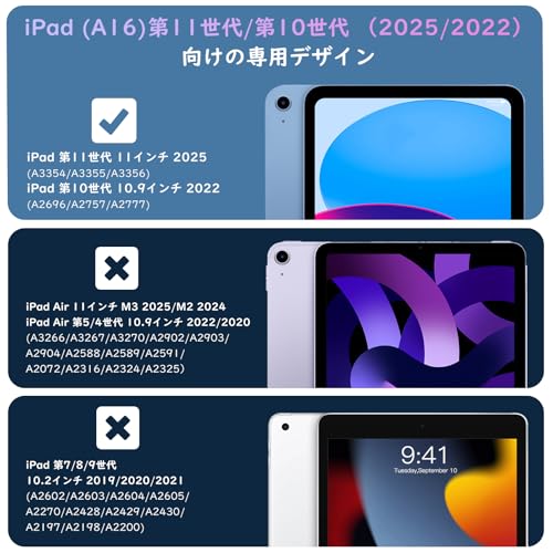 「対応機種」 2025年新発売のiPad 11インチ 第11世代 (A16)(モデル番号:A3354/A3355/A3356)、2022年発売のiPad 10.9インチ 第10世代タブレット専用の保護ケースです(モデル番号:A2696/A2757/A2777)。iPad Air 10.9 第5/4世代(x)、iPad Air 11 第7/6世代(x)、又は他のモデルに適用しませんので、ご購入前に必ずお手元のデバイスの機種/モデル番号をご確認ください。ご注意:Magic Keyboardなど他のキーボード兼カバーと一緒に使用できません。キーボードに接続する場合はこのケースを外す必要があります。