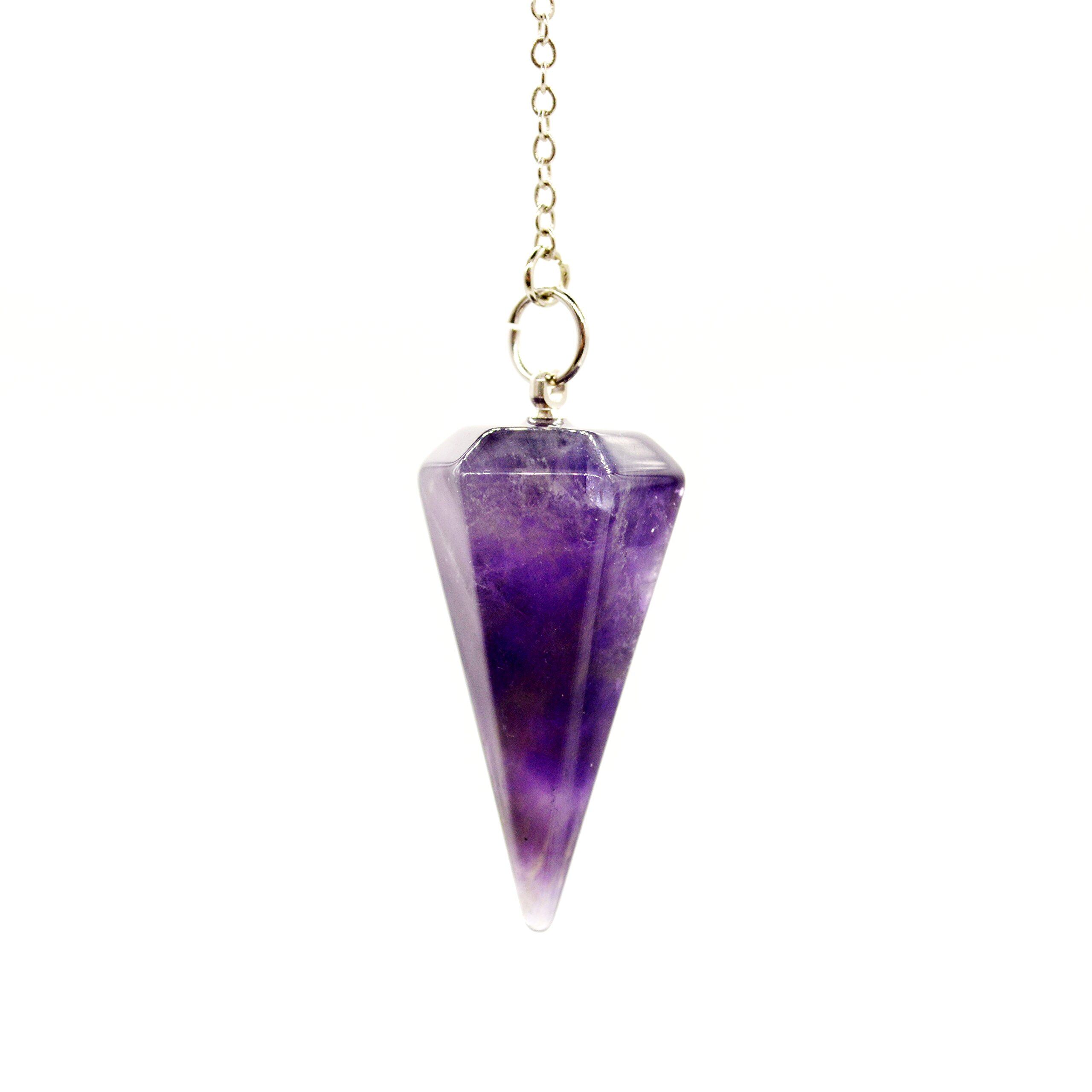 天然石パワーストーン ペンデュラム振り子、 ダウジング風水占い用、 天然紫色アメジスト(紫水晶)製、ヒーリングストーン チャウラストーン六角錐 6面カット、金属チェーン付き