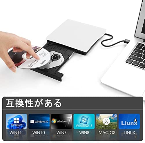cd dvdドライブ 外付け USB 3.0 type-c CD/DVD読込み・録画込み・書込 CD/DVDプレーヤー 外付け光学ドライブ 外付CD・DVDドライブ PC外付けドライブ ポータブルドライブ CD/DVDドライブ ノートパソコン DVD±RW CD-RW USB3.0/2.0 高速 静音 超スリム 薄型 コンパクト Window/Linux/Mac OS対応 (ホワイト)