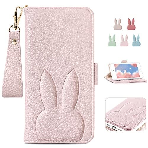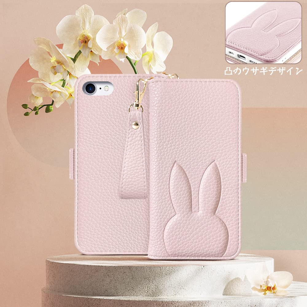 iPhoneSE 第2世代/第3世代 手帳型 ケース 人気 iPhone8 アイフォン8 スマホケース カードポケット 電話ケース 財布型 携帯カバー レディース 女性 上品 ストラップ 美しい アイホン8 かわいい 落ち着いた色 ウサギ 横置き機能 動物 高級PUレザー 贈り物 全面保護ピンク