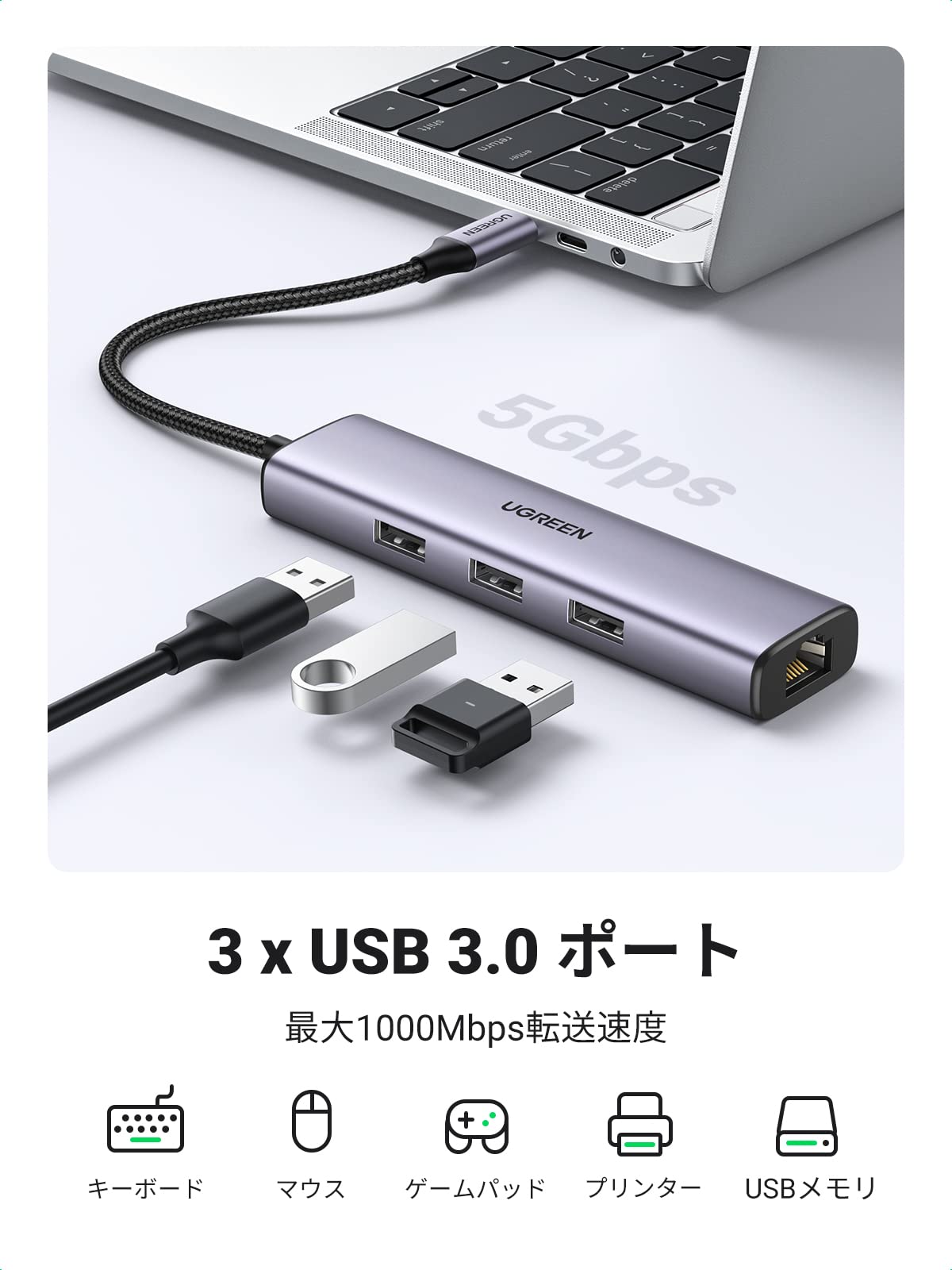 UGREEN USB-C 有線LANアダプター Giga ギガビット RJ45 4-in-1 Lan ハブ 3*USB-A 3.0ポート拡張 USBハブ MacBook iPad Windows Chromebookなどに対応