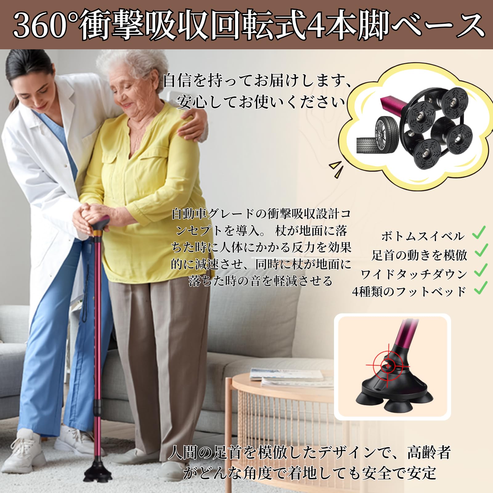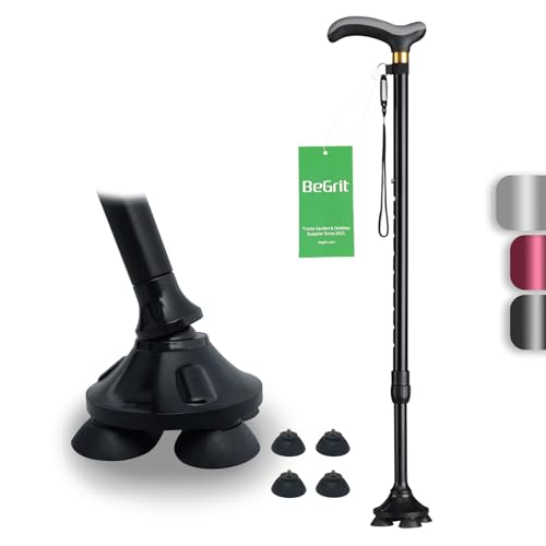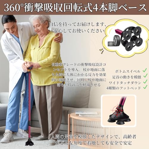 おしゃれ 杖 : 四点滑り止めゴムベース、より安定性と耐久性。一点杖に比べ、より広い範囲をしっかりと支えることができるため、より安定している、杖を握る手の力を弱める。杖の先が360℃ 自由に回転するので、滑り止めベースは、凹凸のある表面で優れた安定性と接地を提供します。 砂利道、石道、凸凹道での衝撃を軽減し、ボディの関節へのダメージを軽減します。(松葉杖のベースを購入する: BeGrit 松葉杖ヘッドの)