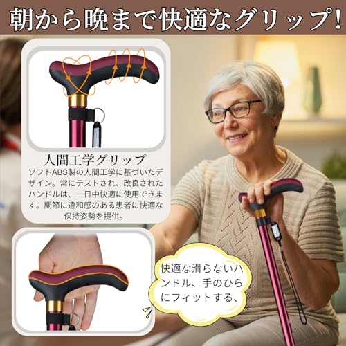高齢者杖-10段階の高さ調節:5段階や7段階の調節可能な杖と比べて、10段階調節可能な杖は、高さの調節がより精密に行え、使用者に最適な快適さとサポート効果を提供します、転倒リスクを軽減し、全体的な安全性を向上させます。独立式の杖は、身長が142センチから188センチの人に適しています。調節ボタンを押して支柱をスライドさせることで、身長に合わせて杖の長さを63~93センチに調節できます。杖の長さは、身長に応じて2.5センチ単位で調節できるため、ほとんどのアジア人男性および女性に適しています。