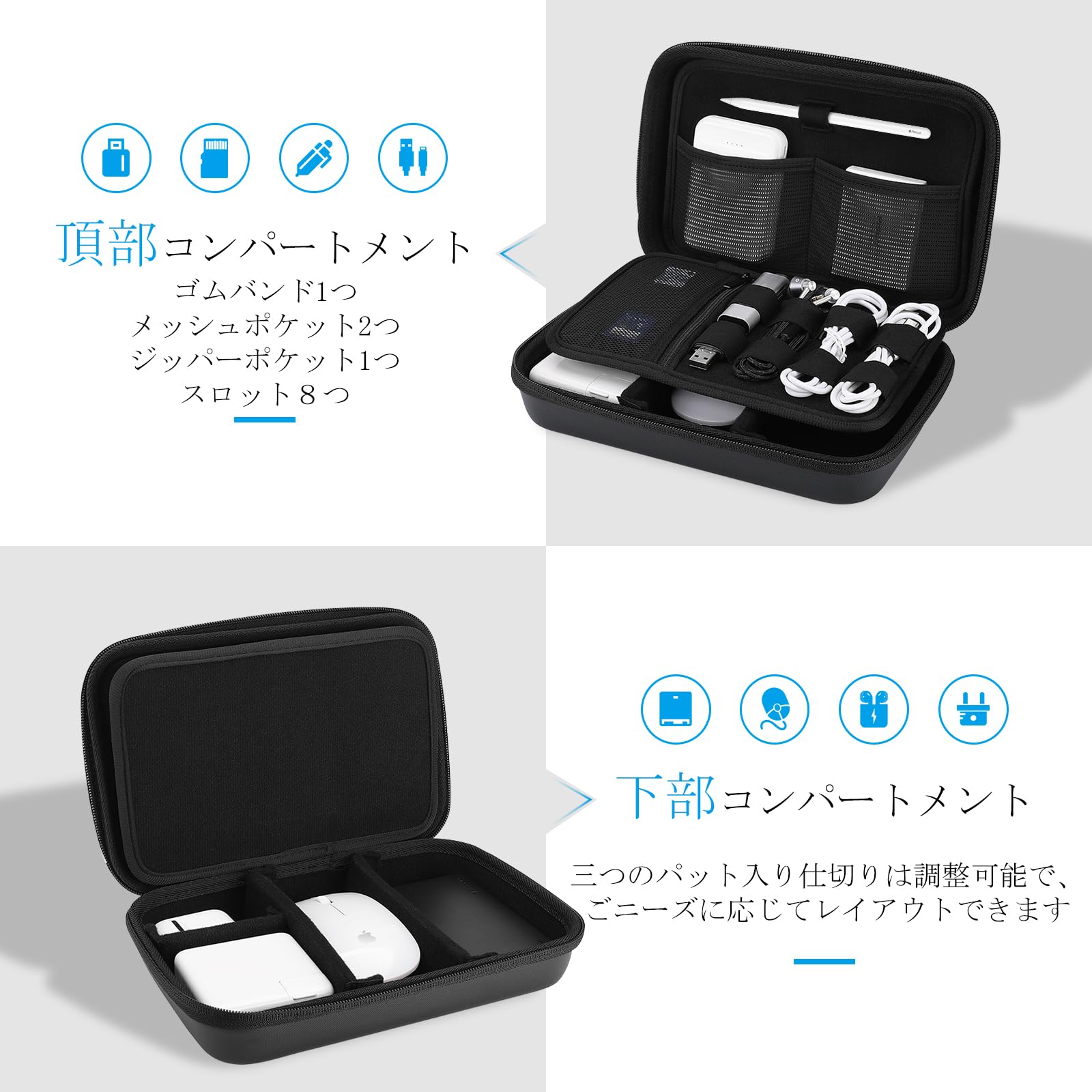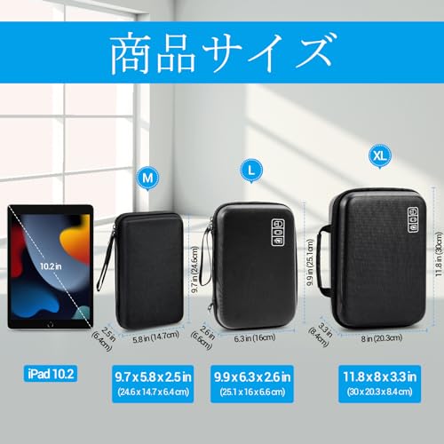 ProCase ガジェットポーチ、防水性のあるEVA材、大容量、3層仕組み MacBook アダプタ・ Magic Mouse 2・ USB Flash Disk・SD収納、スマホ・タブレット充電・ケーブルの小物入れ、PC周辺アクセサリーの整理バッグ– ブラック