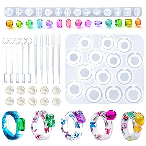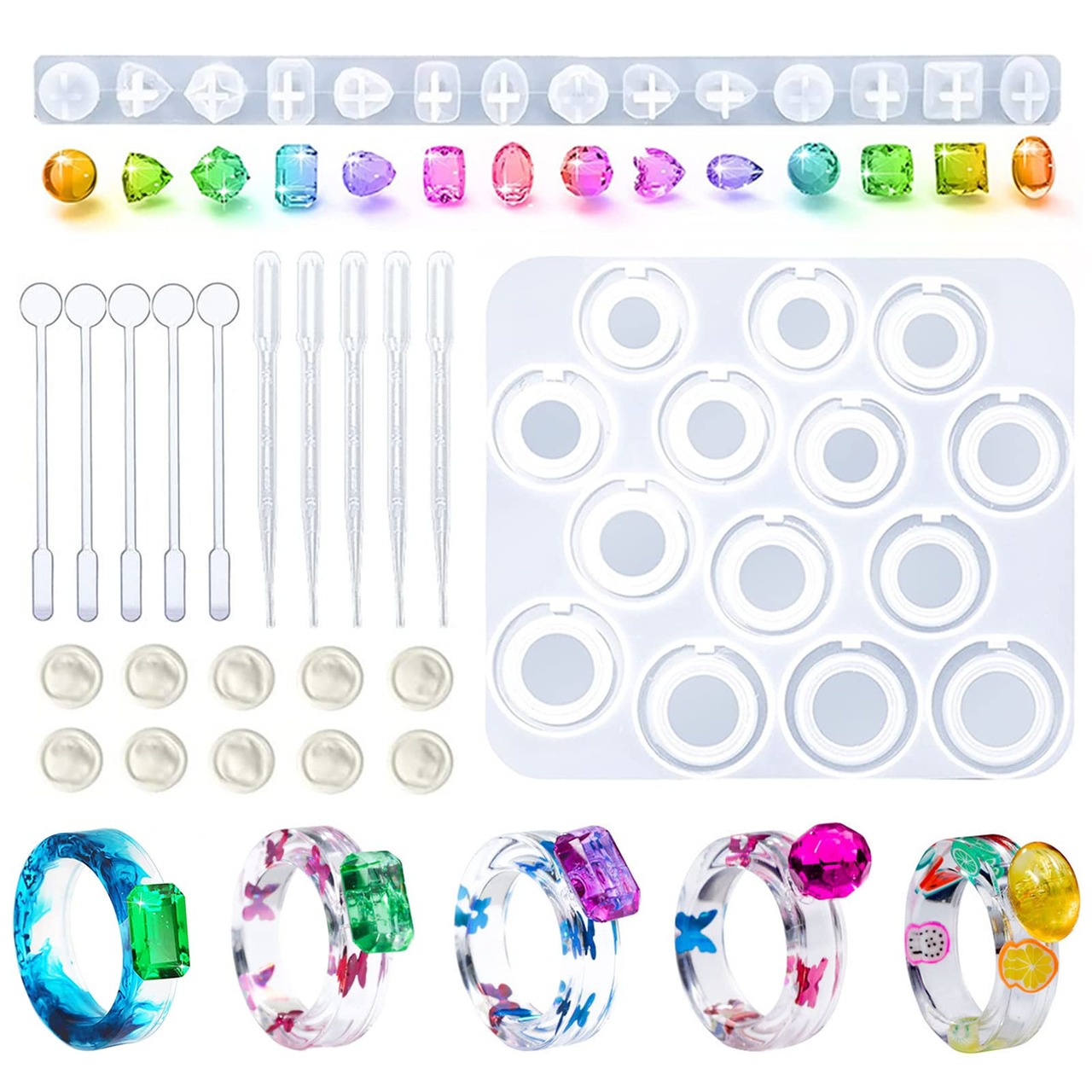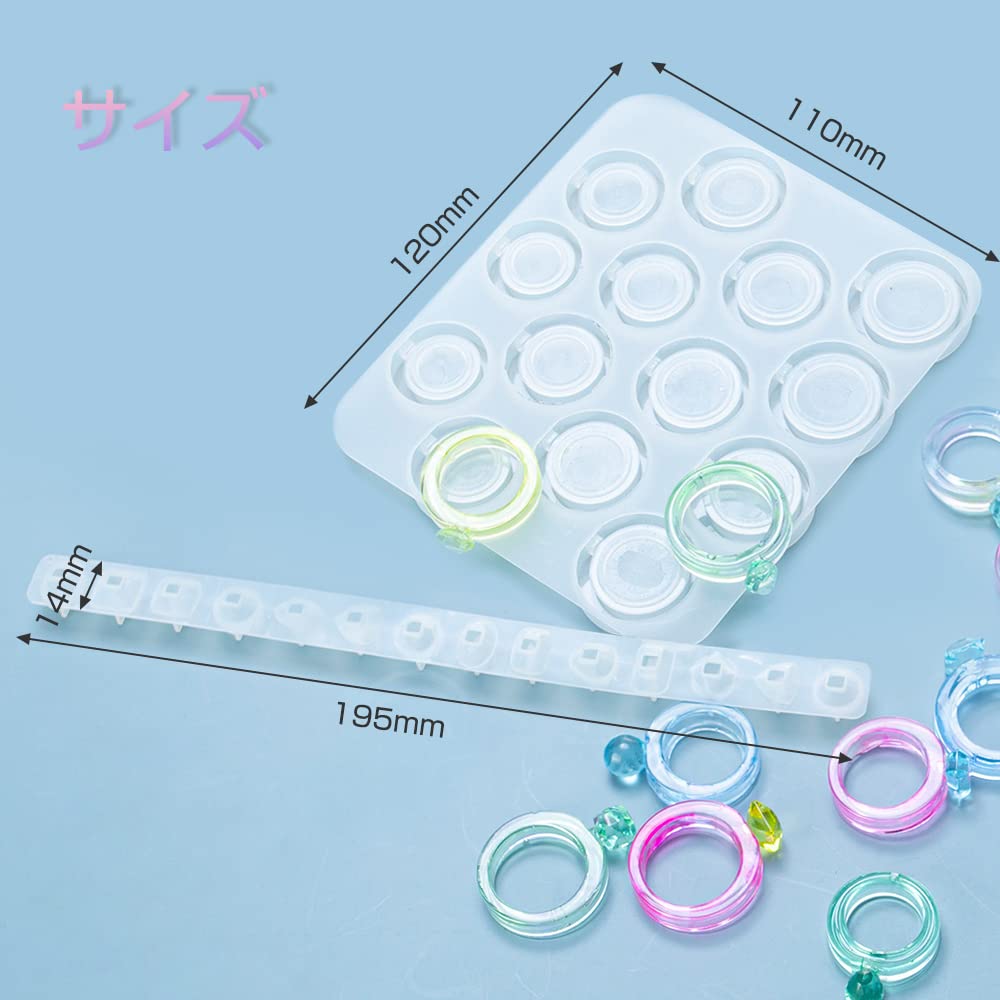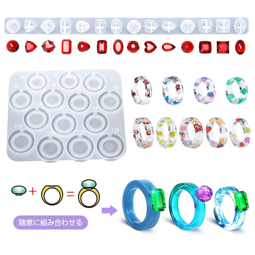 セット内容:指輪シリコンモールド*1、宝石樹脂型*1、ゴム指*10、ストロー*5、攪拌棒*5。