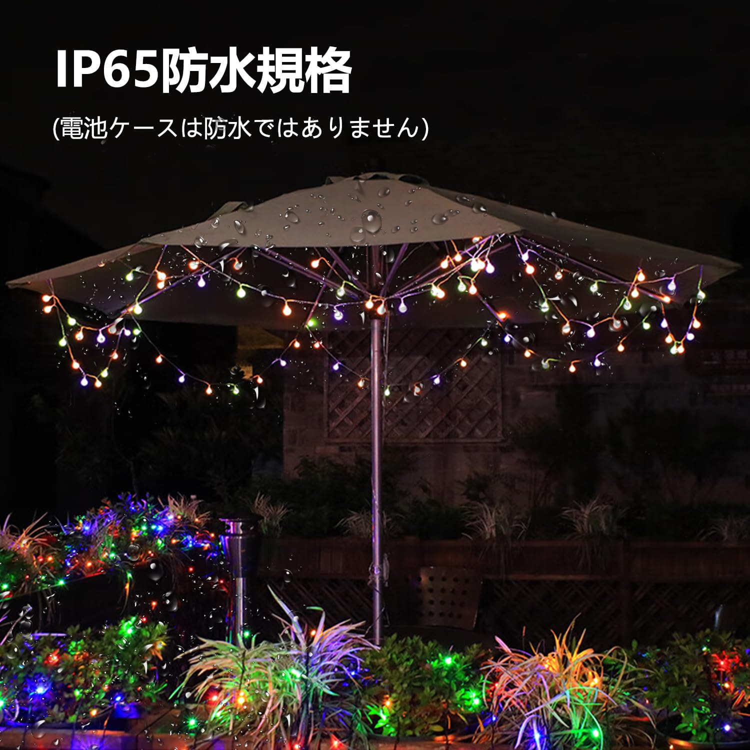 【生活防水&防塵仕様】ストリングスライトはIP65の防水防塵仕様で、屋内での飾りはもちろん、屋外でも雨や雪の日にも安心でご利用いただけるようになります。ご注意:電池ボックスは防水ですが、電池は防水ではないため、水に入れないでください。