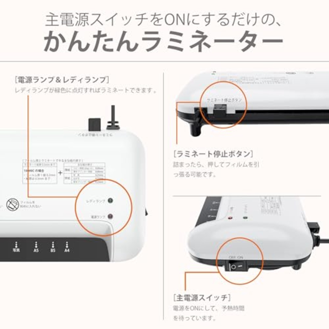 使用方法:スイッチをオン→約3分30を待つ(室温25℃の場合)→“レディランプ”点灯→フィルムを入れる→ラミネート完了→スイッチをオフ(使用完了は必ず電源を切ってください。)