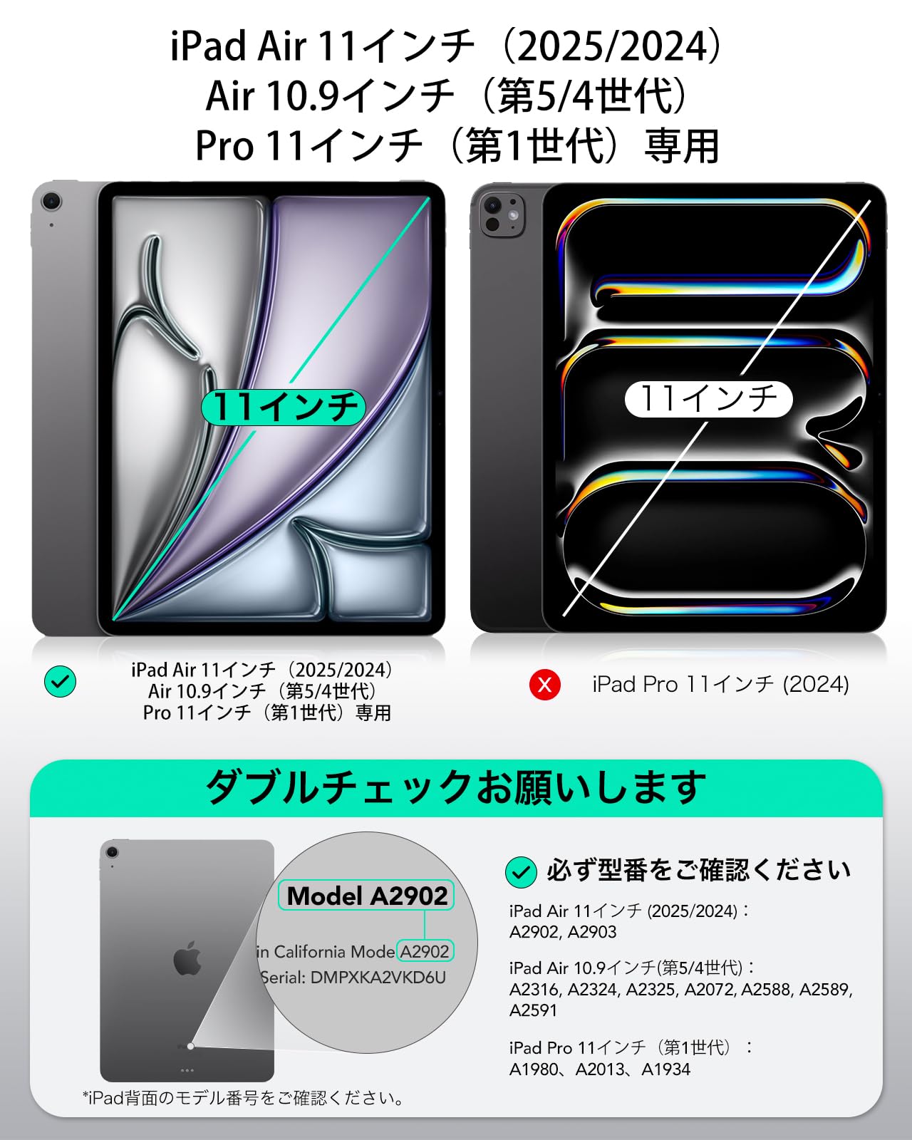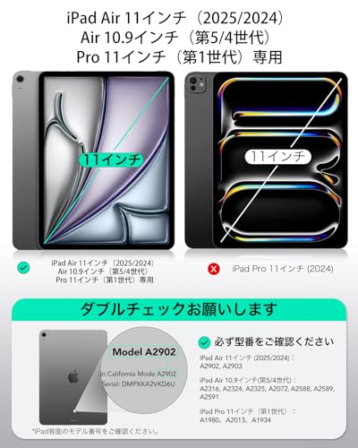【互換性】:iPad Air 11インチ(2025/2024)、iPad Air 第5/4世代(2022/2020)、iPad Pro 11インチ(2018年)専用です。モデル:A2902、A2903、A2316、A2324、A2325、A2072、A2588、A2589、A2591、A1980、A2013、A1934。ご注意:iPad 11世代(11インチ)と他のiPadモデルには非対応です