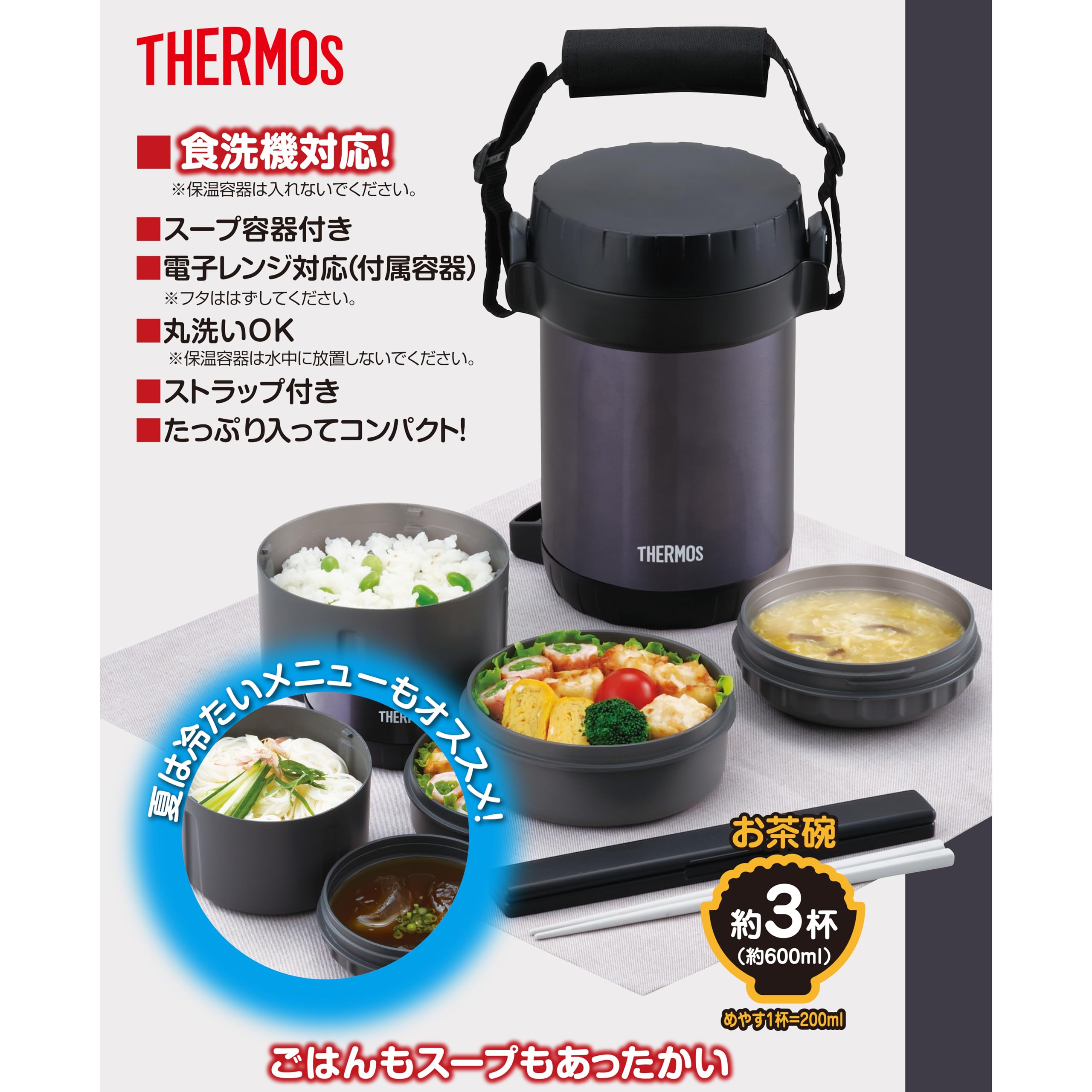 容量:ごはん容器/0.6L(炊く前のお米の量/0.23L(約1.3合))、おかず容器/0.4L、スープ容量/0.3L