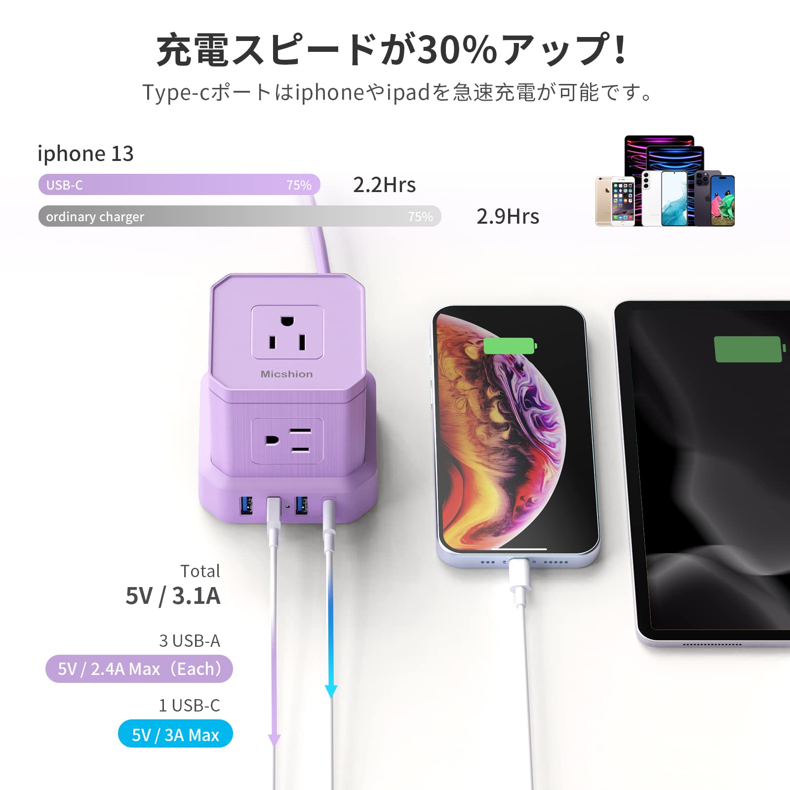 【5個ACポートと4個USBポート】5口のAC差込口と1つのUSB Type-Cポート、3つのUSB-Aポートを備えており、スマホやタブレットをコンセント タップ用プラグなしで接続できる手軽さも適当です。USB Type-Cポートは、iPhoneへ一般的な5W出力の充電器に比べ、充電スピードが30%アップします。複数機器を接続した場合、最大2400Wの消費電力に対応し、自動判別機能を通して、接続されたデバイスに最適な電流を出力します。パソコンやテレビ周りなど、コードが集中しがちな場所でもすっきりと使えます。