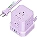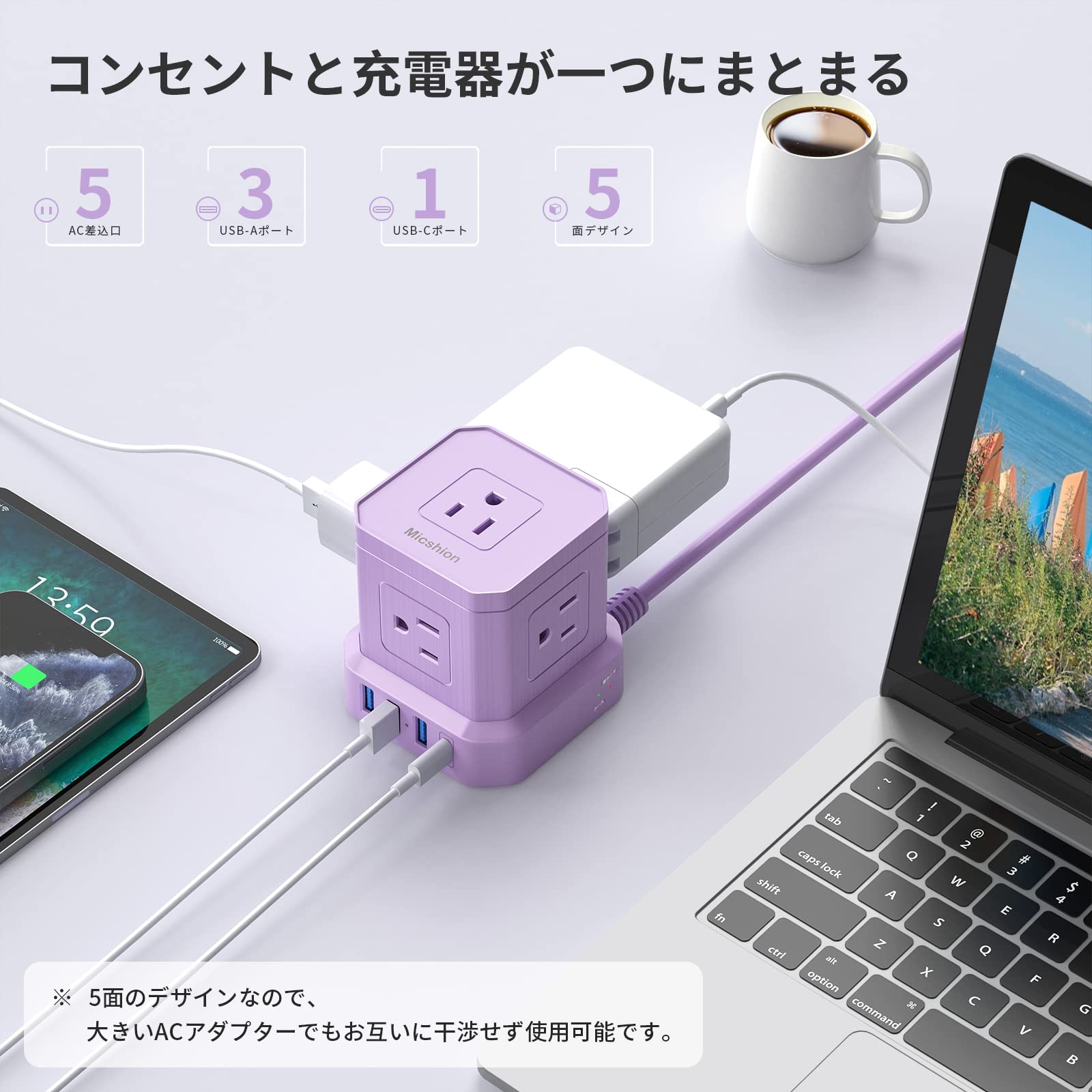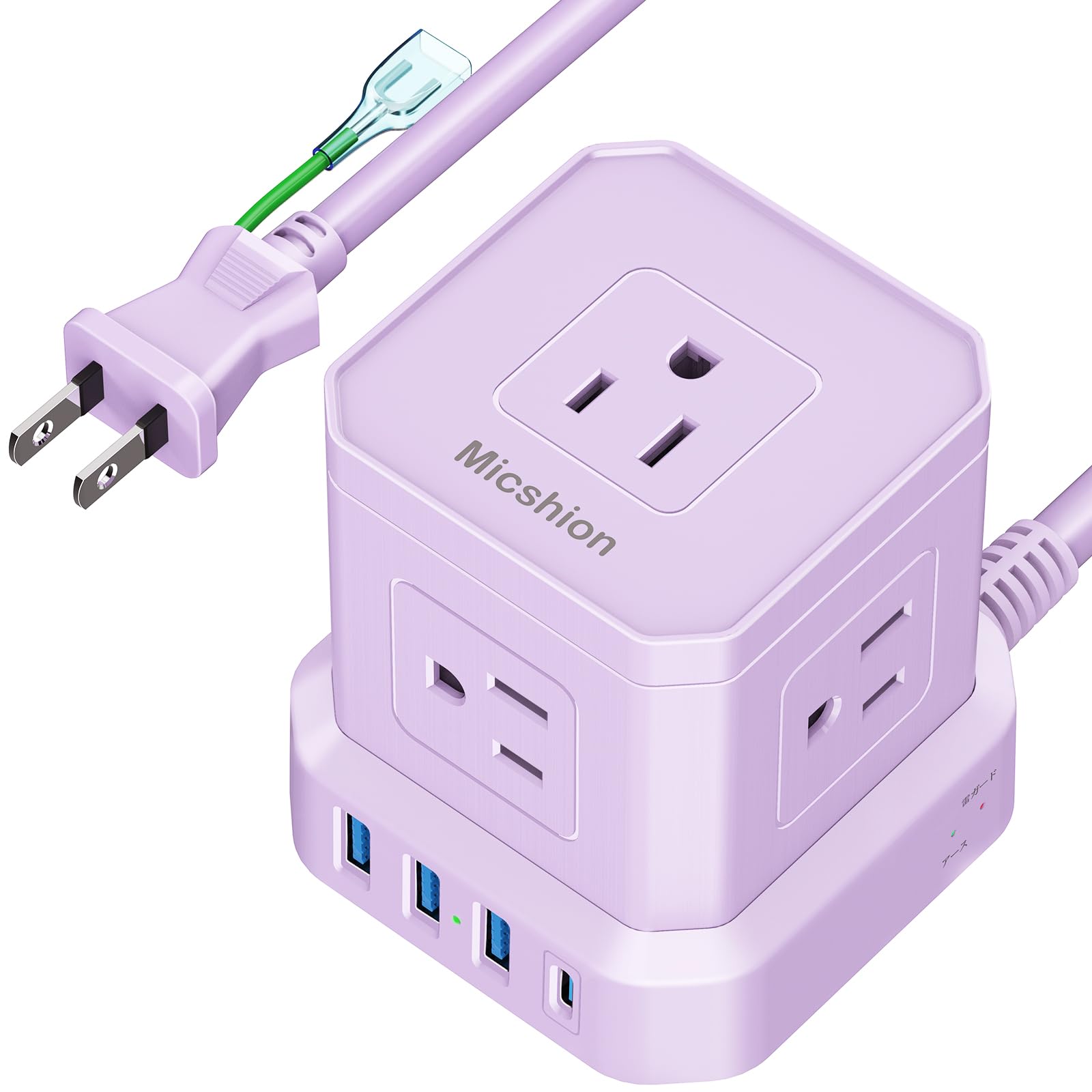 Micshion キューブ型電源タップ(2400W) Type-C付 延長コード 2m コンセントusb付き 雷ガード 5個AC口 3個USBポート 1個Type-C 電源タップ usb付き タコ足配線 テーブルタップ たこあしコンセント マルチタップ 安全保護機能 自宅用 会社用 パープル