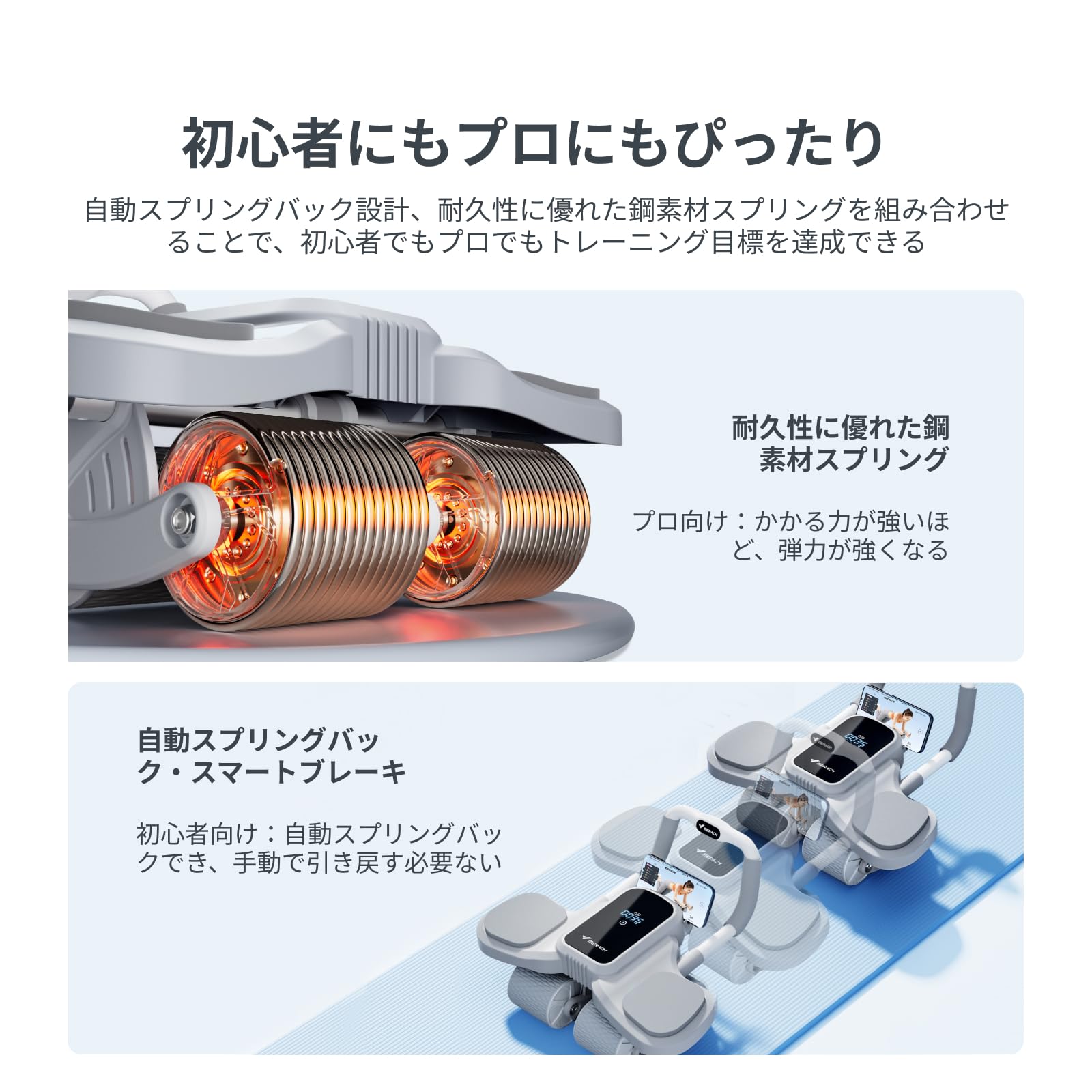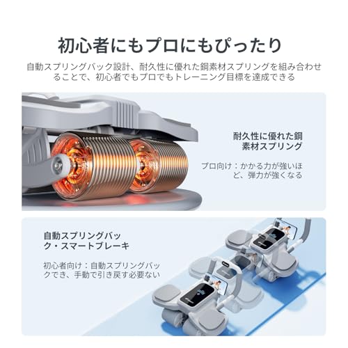 【自動スプリングバック・スマートブレーキ】この腹筋ローラーには自動リバウンド機能が搭載されており、手動で引き戻す手間が省け、トレーニング効率が向上し、初心者にも使いやすくなります。また、上級者が高強度のトレーニングをしたいというご要望に応じて、腹筋ローラーが前に転がる距離が大きいほど、蓄積された弾力が大きくなる設計を施しました。これにより、より強い抵抗を感じることができ、腹筋トレーニングの効果も期待できます。