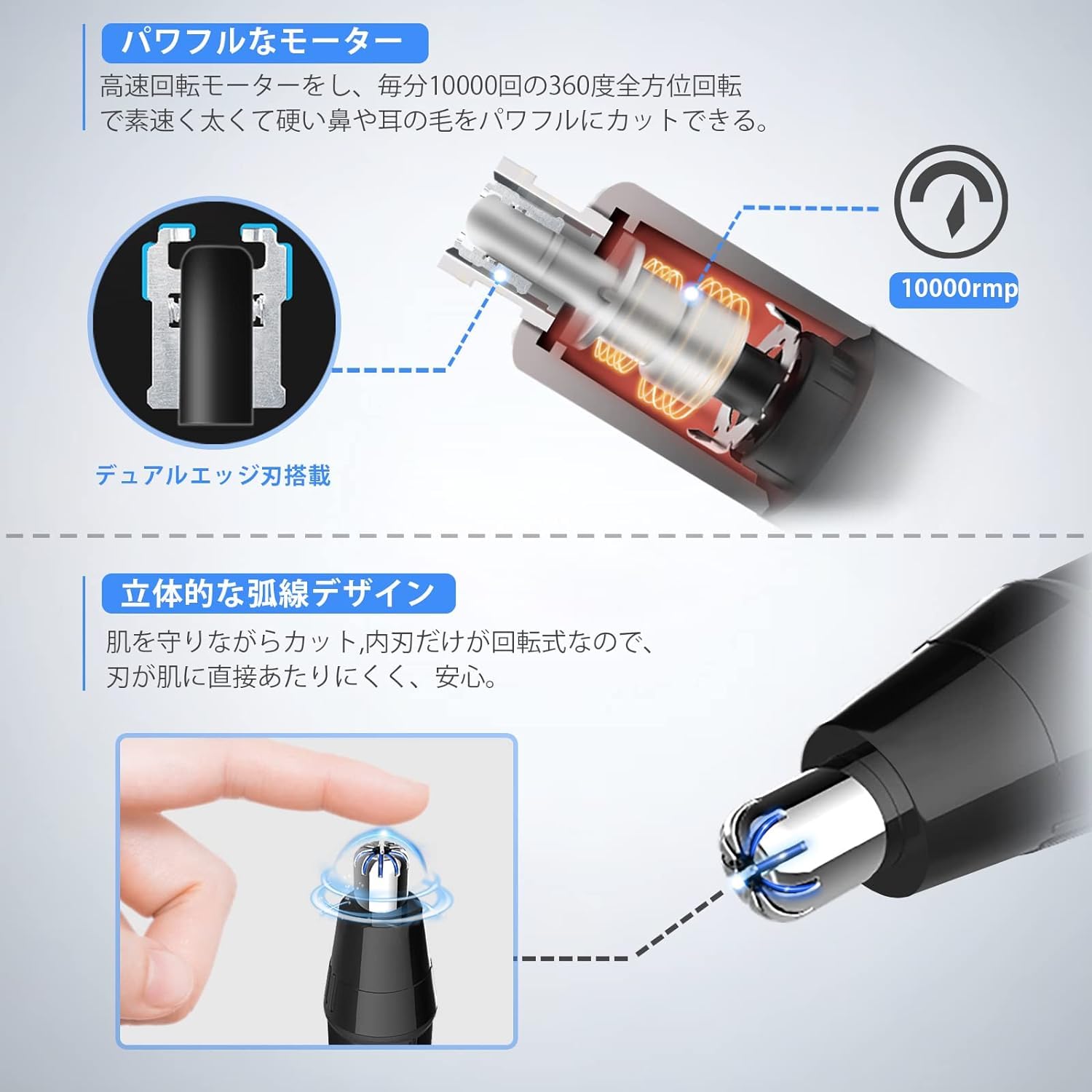 【肌を守りながら鼻毛カット】高速回転パワフルなモーターを搭載し、毎分10000回の360度全方位回転で素速く太くて硬い鼻や耳の毛をパワフルにカットできる。回転式内刃は人間工学に基づいた立体的な弧線デザインので、鼻毛を引っ張ったり、鼻の内部を傷つけたりすることなくしっかりフィットし、抗アレルギー性も備えているので、より安全で快適にお使いいただけます。デュアルエッジ刃で、鋭い切れ味が続く。ダブル刃ですばやくスムーズにカットするから、きれいな仕上がりに、従来鼻毛ハサミの2倍スムーズなカットを実現!