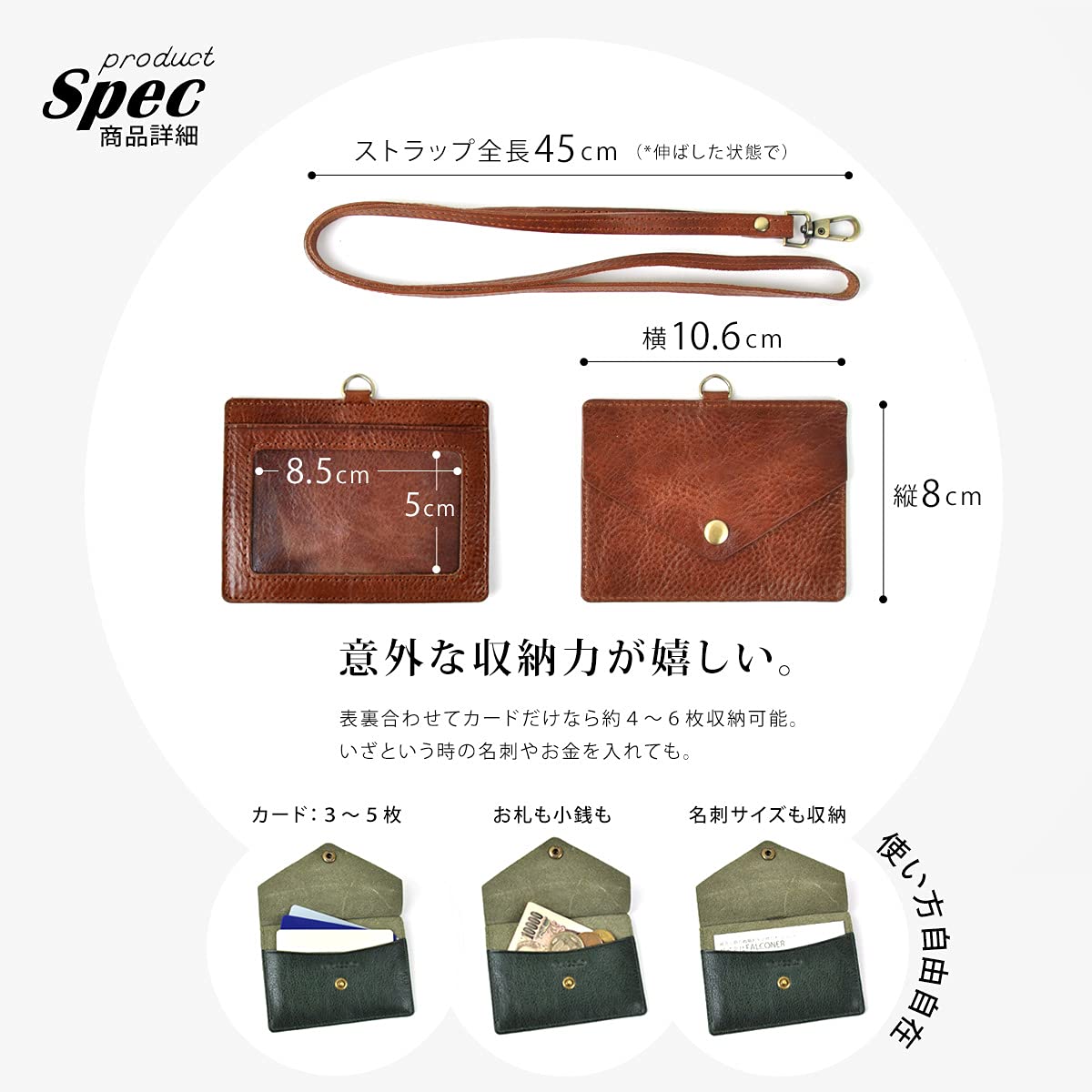 [素材] 本革 イタリアンレザー [スペック]・ IDポケット×1 ・フリーポケット×1・ストラップ×1 [サイズ]縦80mm × 横106mm × 厚み2mm 重さ 43g