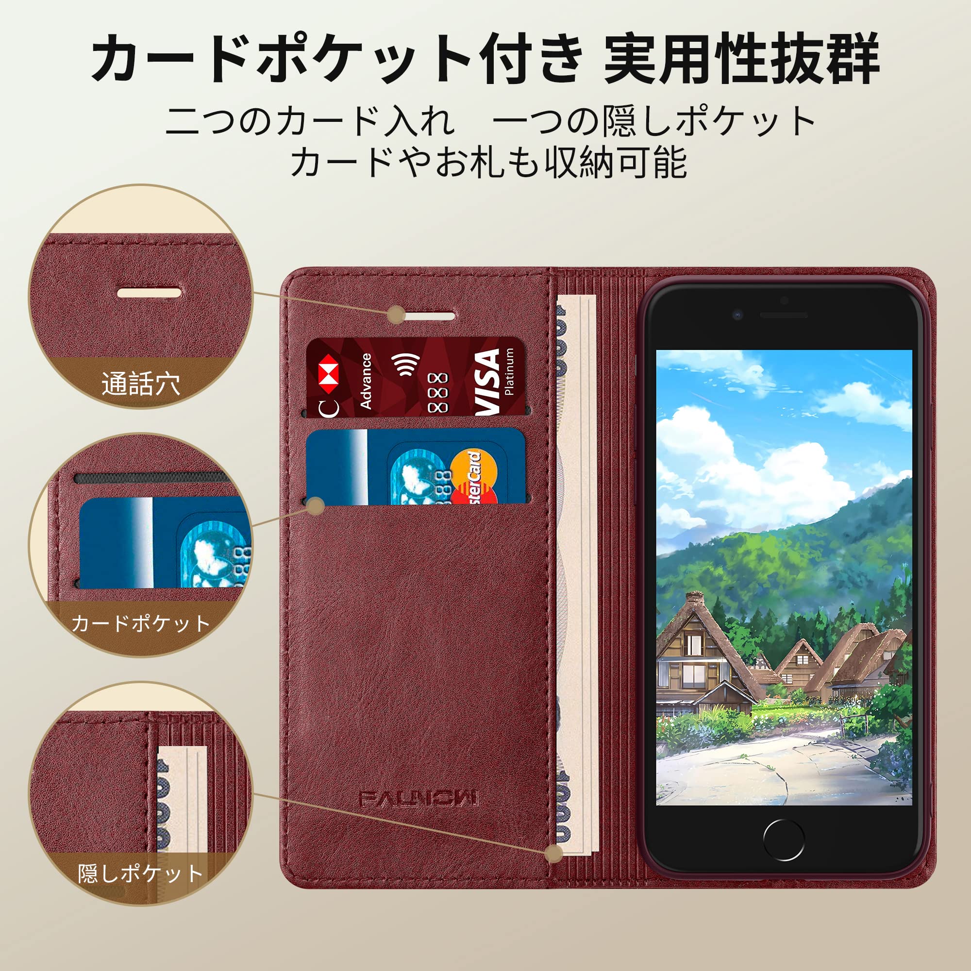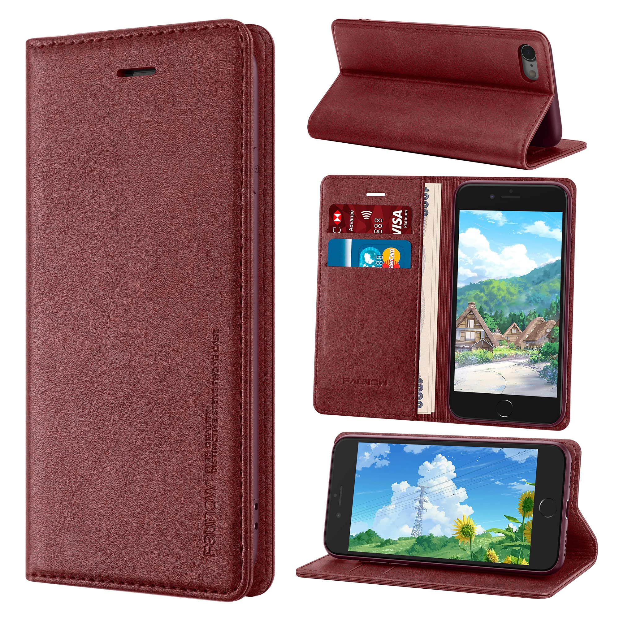 FAUNOW iPhone SE ケース 手帳型 iPhone8 手帳型 iphonese第3世代 第2世代 ケース スマホケース iphone se iphone se2/se3/8/7 ケース PUレザー 携帯ケース 耐衝撃 放熱性 スマホケース マグネット式 軽量 薄型 全面保護 スタンド機能 カード収納 4.7インチ対応(レッド)