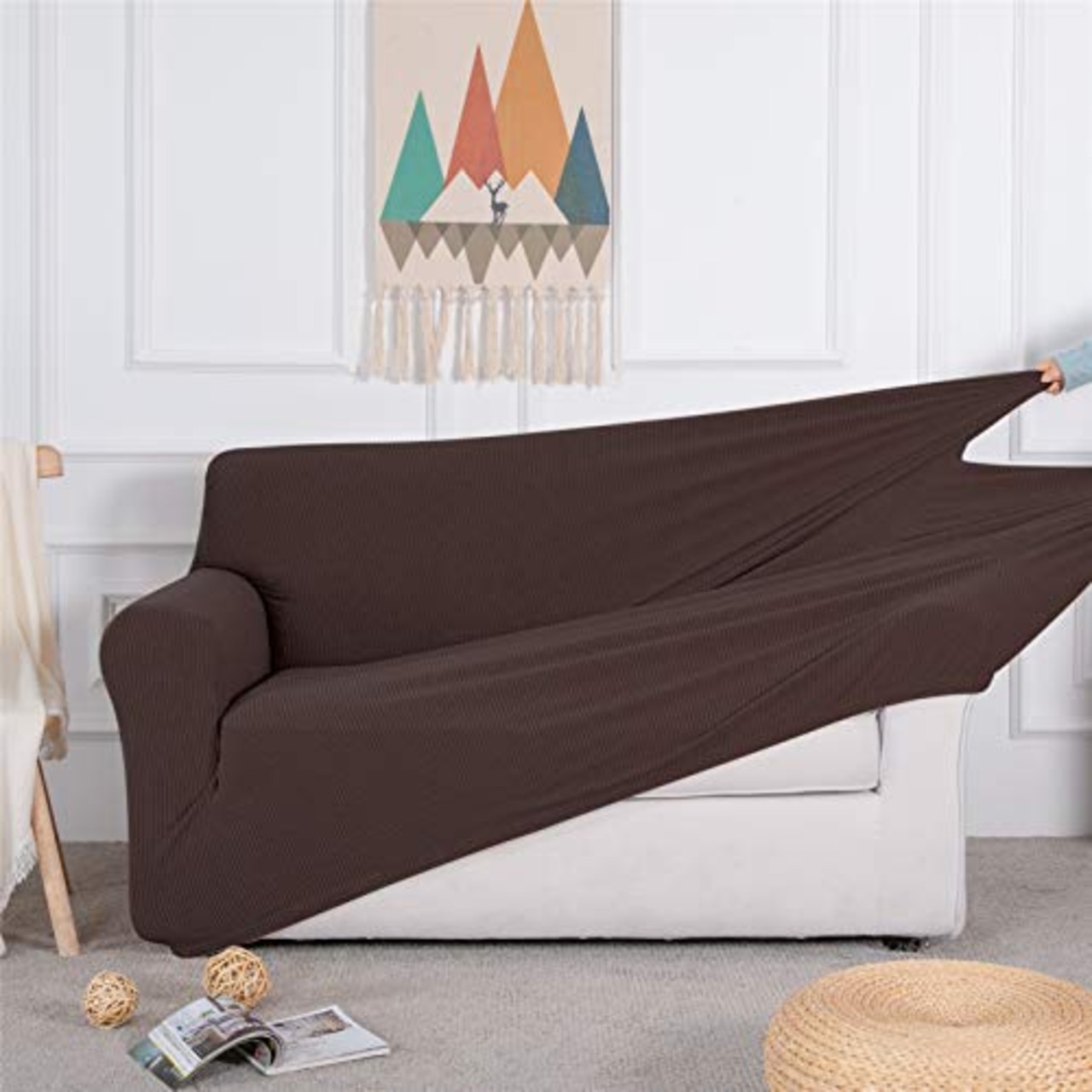 Topfinel ソファーカバー 3人掛け 肘付き 無地 北欧風 ストレッチ フィットタイプ 伸縮素材伸び良く 滑り止め 柔らかい 犬 猫 傷 防止 超便利 四季適用 (チョコレート)