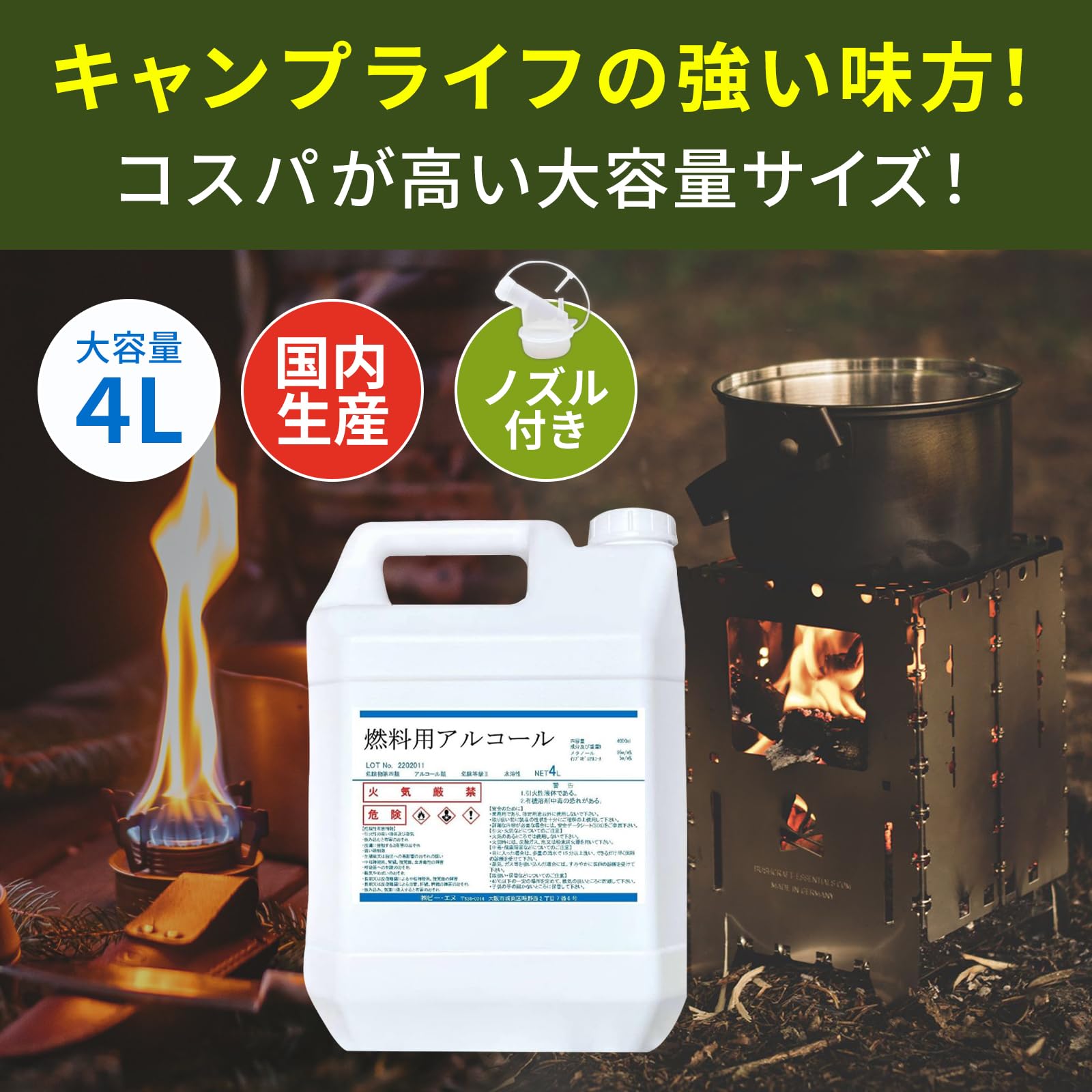 【大容量】業務用サイズ4リットルになります。小さいボトル容器に小分けして一般の方にもご利用いただけます。好評の「注ぎやすいノズル付き」で便利な燃料用アルコールです!